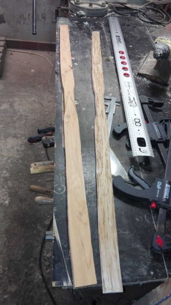 In der Zwischenzeit habe ich den Eibenkern getapert und mit Epoxidharz aufgeleimt. Das Ganze wurde mit etwas Reflex auf ein Balken gezwungen und durfte an der Heizung trockenen. Heute habe ich den Bogen seine Form gegeben , die Nadeln eingepasst und mit ca.7° eingeleimt. Vor dem Leimen wurde der Bogen bereits vorgetillert. Dabei habe ich gemerkt, dass die Kombi Hasel/Eibe gar nicht so schlecht ist. Ich bin echt gespannt wie der wirft