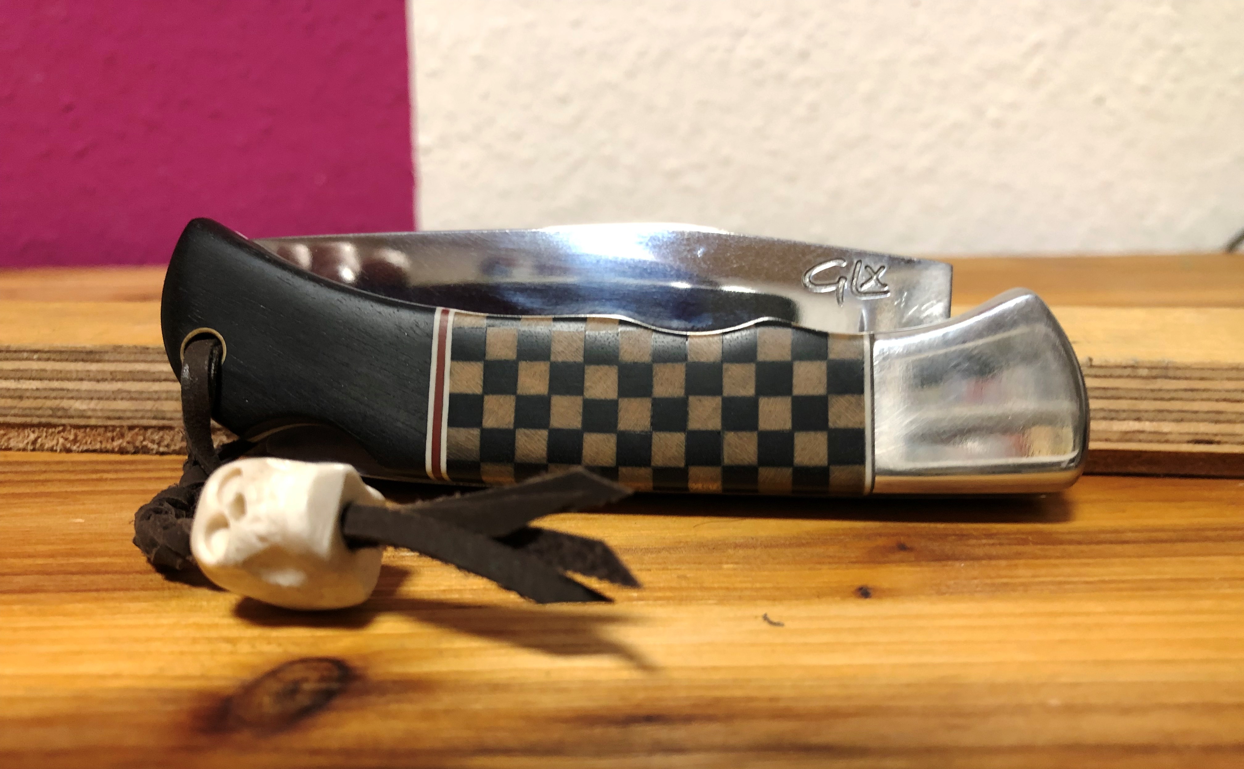 Sehr ansprechend finde ich die Grifform und ich halte sie auch für ergonomisch gut, prima auch, dass die untere Ecke der Klinge rund geschliffen ist, das minimiert die Verletzungsgefahr (ich hab mir an einer solchen Ecke schon mal böse wehgetan und in meinem Zorn das Problem dann mit dem Bandschleifer gelöst