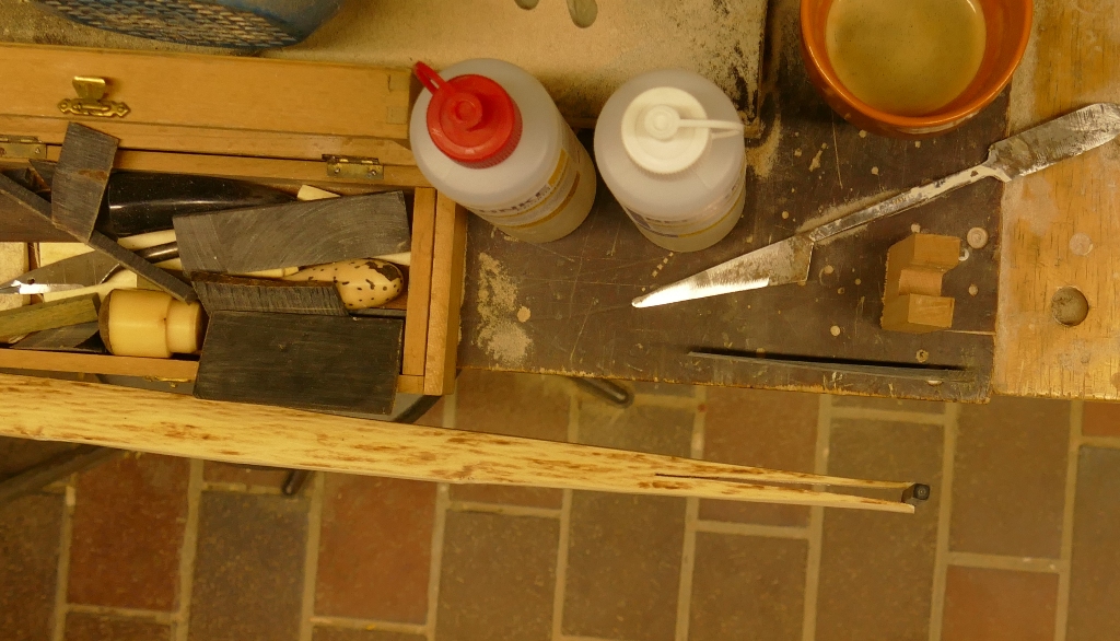 Ich hab heute Griffbereich und Wurfarme mit dem Ziehmesser bearbeitet und schonmal vorsichtig ein bisschen gebogen (Bodentiller). Zur Tipverstärkung hab ich die Wurfarmenden eingesägt (Bandsäge) und Keile aus Horn eingesetzt...