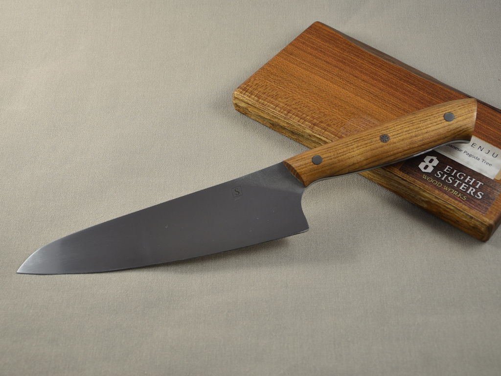 Das Griffholz habe ich aus Japan mitgebracht, gefunden in der Kappabashi in Tokio. Enju oder Japanischer Pagodenbaum (Styphnolobium japonicum). Ich habe das Holz stabilisiert was ganz gut ging.