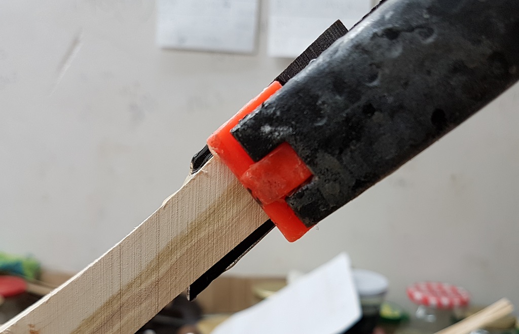 Heute ging es weiter. Die Bogenform ausgesägt und zurecht geraspelt, den Griffbereich angepasst (schmaler und dünner gemacht) und den Siyahs die entgültige Form gegeben. Alle Kanten mit der Ziehklinge abgerundet.