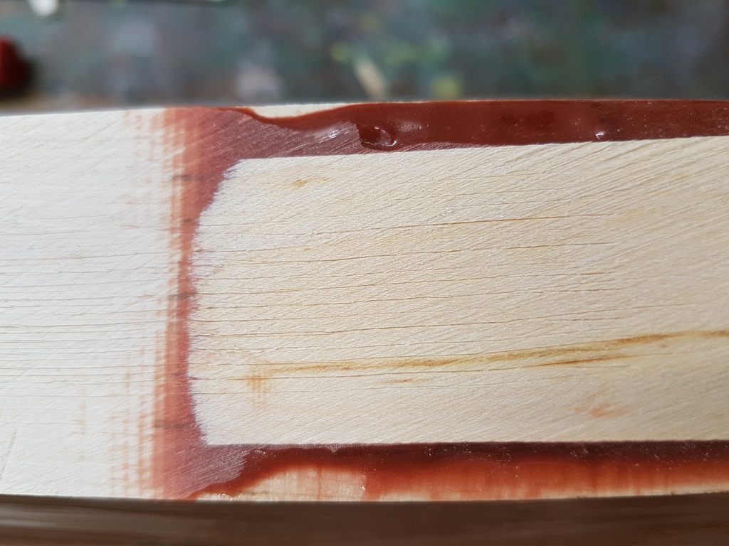 Den Taper der beiden Laminate habe ich wohl ganz gut geschätzt, ich habe nur an 2-3 Stellen nochmal kurz mit der Zieklinge gekratzt. Ich gehe mal davon aus, dass ich im mittleren WA-Bereich noch etwas kratzen muss, wenn der Bogen auf Standhöhe aufgespannt ist, aber ansonsten isser fast fertig (wird ja auch Zeit