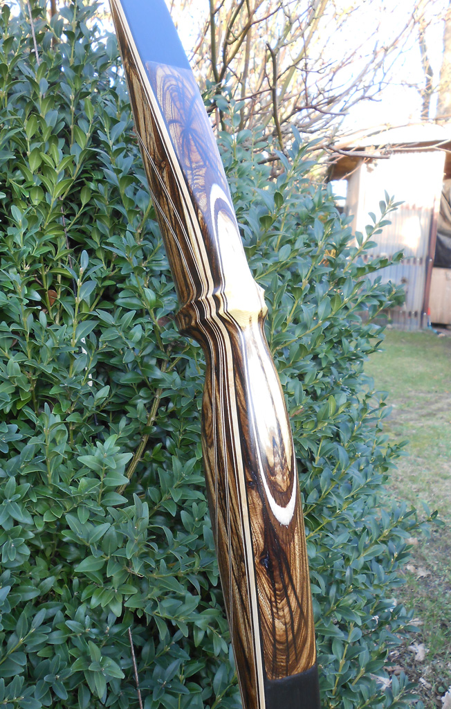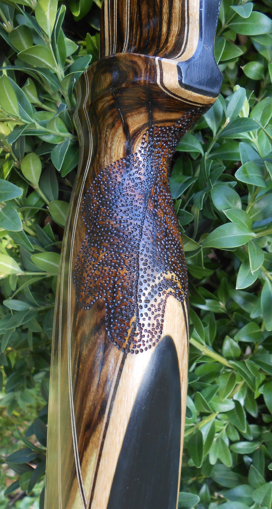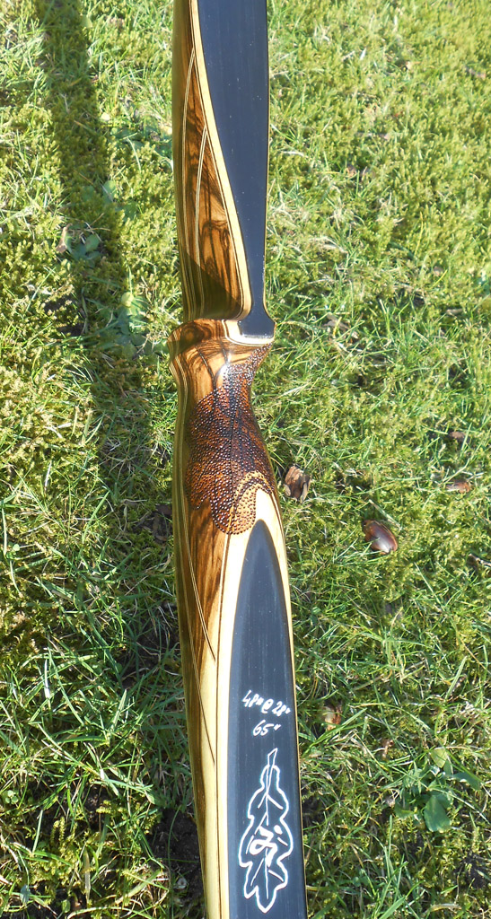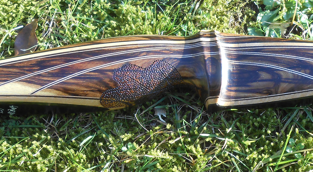 Die Wurfarme bestehen aus Bambus mit Zierlaminaten aus geräucherte Eiche/Birke und Schwarzglas. Der Griffbereich und Overlays besteht aus Goldregen, mit Zierlaminat aus geräucherte Eiche und Birke. Der Goldregen wurde letztes Jahr geeschnitten, weil er morsch war und Pilzbefall hatte, daher auch die dunklen Streifen im Holz, dass hat aber bisher keinen Einfluss auf die Haltbarkeit des Bogens. Die Griffpunzierung hab ich mit dem Drehmel und einen 0,5 mm Kugelfräser gemacht.