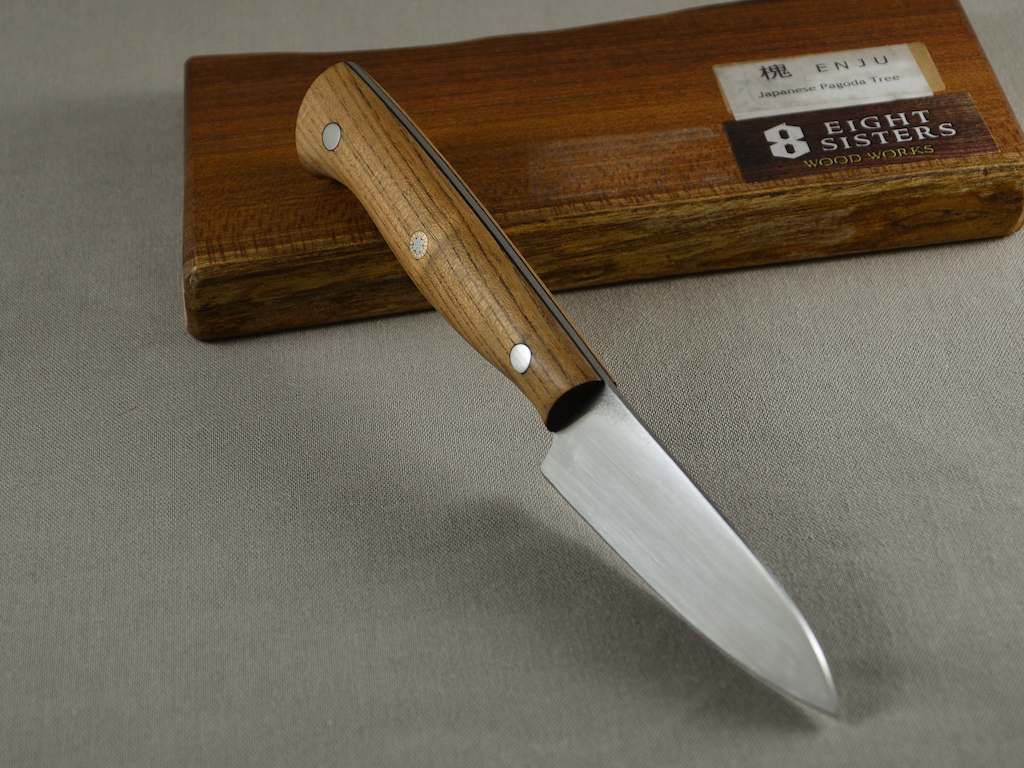 Das Griffholz habe ich aus Japan mitgebracht, gefunden in der Kappabashi in Tokio. Enju oder Japanischer Pagodenbaum (Styphnolobium japonicum). Ich habe das Holz stabilisiert was ganz gut ging.
