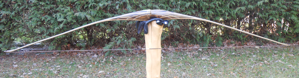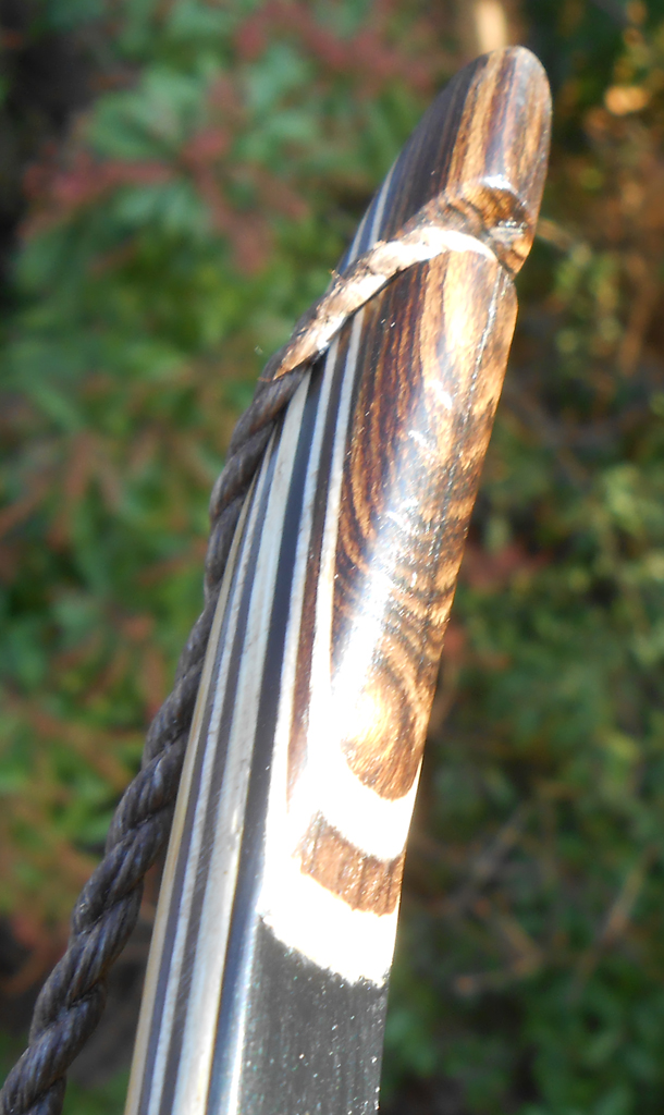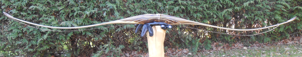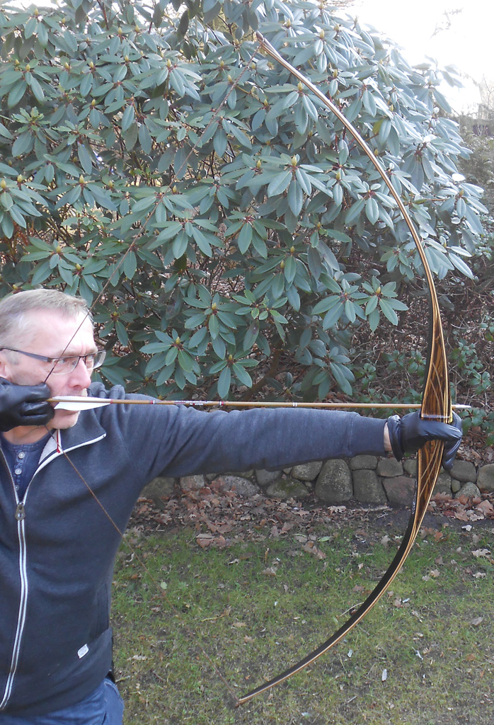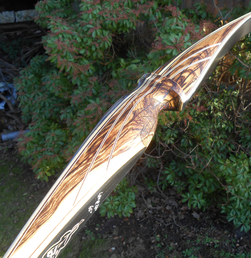 Die Wurfarme bestehen aus Bambus mit Zierlaminaten aus geräucherte Eiche/Birke und Schwarzglas. Der Griffbereich und Overlays besteht aus Goldregen, mit Zierlaminat aus geräucherte Eiche und Birke. Der Goldregen wurde letztes Jahr geeschnitten, weil er morsch war und Pilzbefall hatte, daher auch die dunklen Streifen im Holz, dass hat aber bisher keinen Einfluss auf die Haltbarkeit des Bogens. Die Griffpunzierung hab ich mit dem Drehmel und einen 0,5 mm Kugelfräser gemacht.