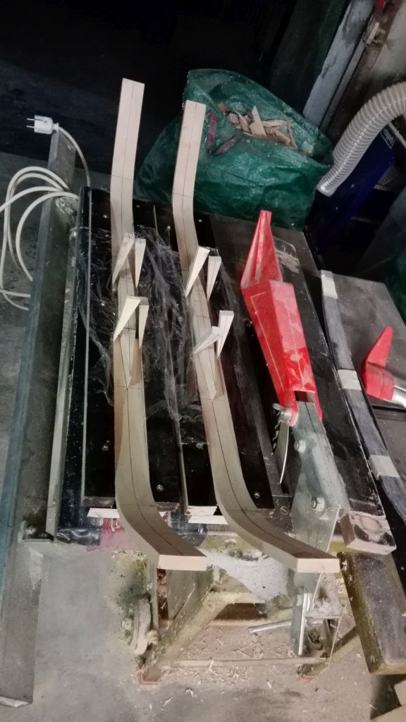 Gestern habe ich die Siyahs zusammen geklebt, d.h. ich habe natürlich gewachsene Siyahs in der Mitte aufgeschnitten und mit 4mm Kirsche und Büffelhorn zusammen geklebt. Die einen waren aus Apfelholz und die anderen aus Hasel. Die Hasel sind mit den gleichen Maßen 10g leichter als die Apfel ( Hasel 41g ; Apfel 51g). Das ist gerade bei Bögen mit leichtem Zuggewicht interessant. Alle 4 Siyahs haben den Belastungstest mit 80# bestanden. Des weiteren habe ich mit 4 Tools aus Holz gebaut, damit die Spleiße beim Festzwingen nicht mehr heraus rutschen. Das funktioniert wunderbar ;)