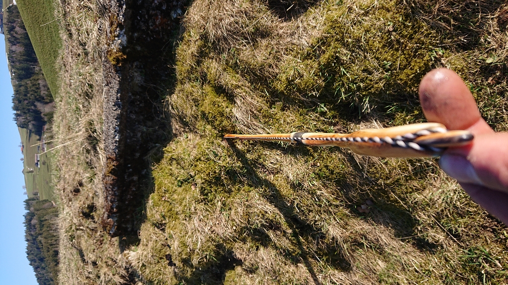 Es ist das erste Mal das ich mit Eibe gearbeitet habe. Der Bogen entstand aus einem Eibenast der auf der dicken Seite 6cm Durchmesser hatte und auf der einen Seite von von Ästen übersäht und recht krumm war. Leider waren alle Äste auf der oberen Seite des Astes da wo eigentlich das schöne Zugholz liegt, deswegen habe ich mich für die Unterseite des Astes als Bogenrücken entschieden. Nach einem einem regelrechten Dampf/Heissluftmassacker gab ich mich dann zufrieden mit dem Sehenenverlauf. Es wäre beinahe ein Kinderbogen geworden aber ich wollte unbedingt ein Eibebogen und da ist er. Habe in Heute ordentlich Eingeschossen und bin echt zufrieden, mann ist Eibe was geiles 8)