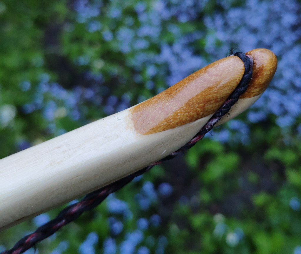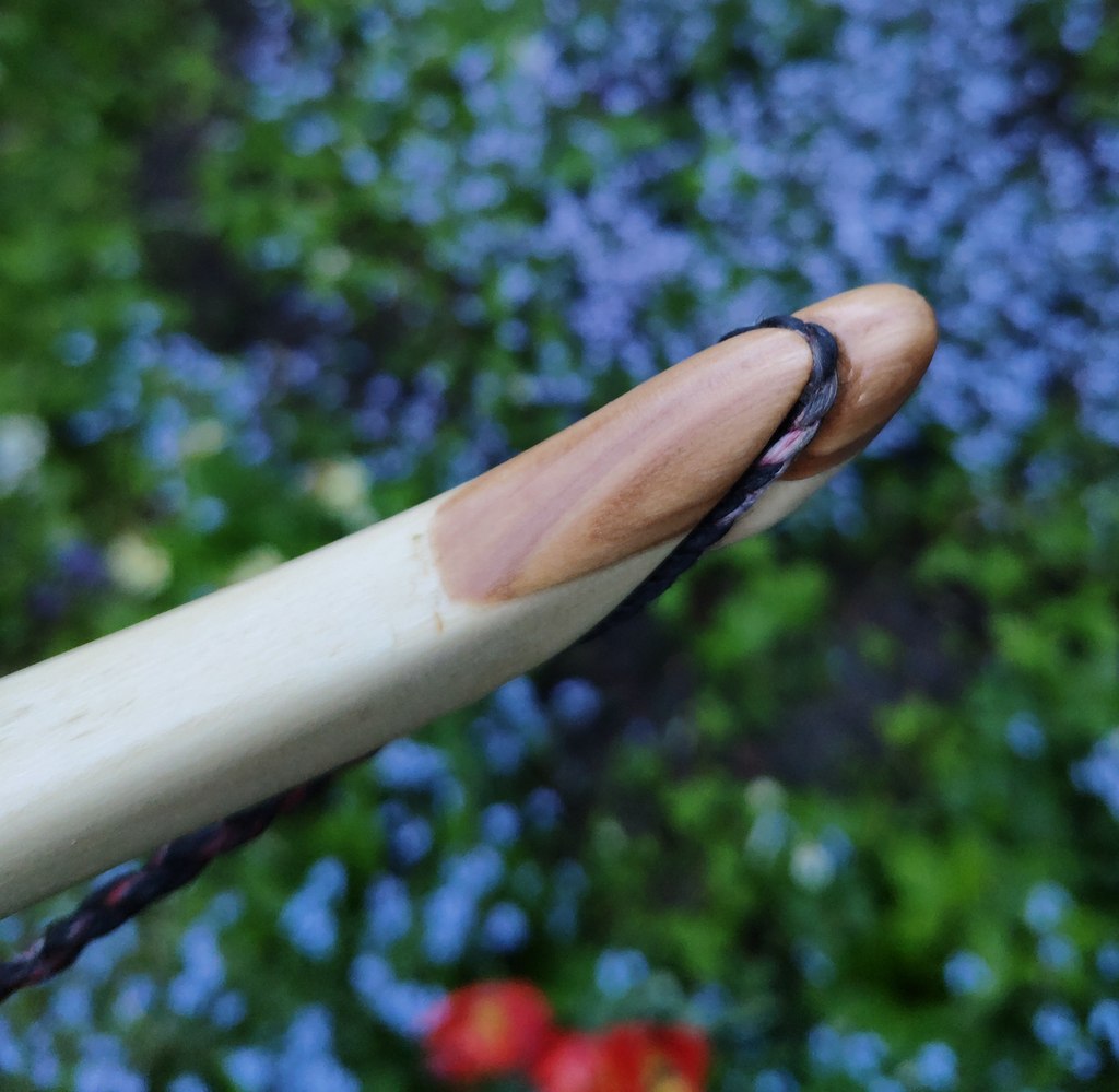 ich hatte beim Quick and Dirty auf dem letzten SDBBT einen Flachbogen aus Holunder gebaut, mein siebter Bogen. Bis auf die Nocken (waren mit 5 Minuten Epoxy geklebt und sind leider beide nach dem SDBBT abgefallen...) und eine leichtes Tempern des Bauches ist der Bogen noch so wie auf dem SDBBT gebaut, er wurde auch nicht nachgetillert. Nachdem er sich auf einem Clout-Turnier ganz ordentlich gehalten hat habe ich ihn auch endlich hübsch gemacht. Vor dem Turnier hatte ich ihn leicht Reflex gebogen und vorsichtig am Bauch getoastet (Oberflächentemp. max 200 °C). Damit ist der gewachsene Deflex weitgehend verschwunden, und das Profil ist auch nach den ca. 100 Schuss auf dem Clout-Turnier noch stabil geblieben. Die 540 grain schweren Bambuspfeile flogen zuverlässig auf die 165 m, der weiteste Schuss mit den schweren Pfeilen war ca. 20 große Schritte hinter dem Clout. Leichtere Holzpfeile (ca. 400 grain) flogen nur unwesentlich weiter.