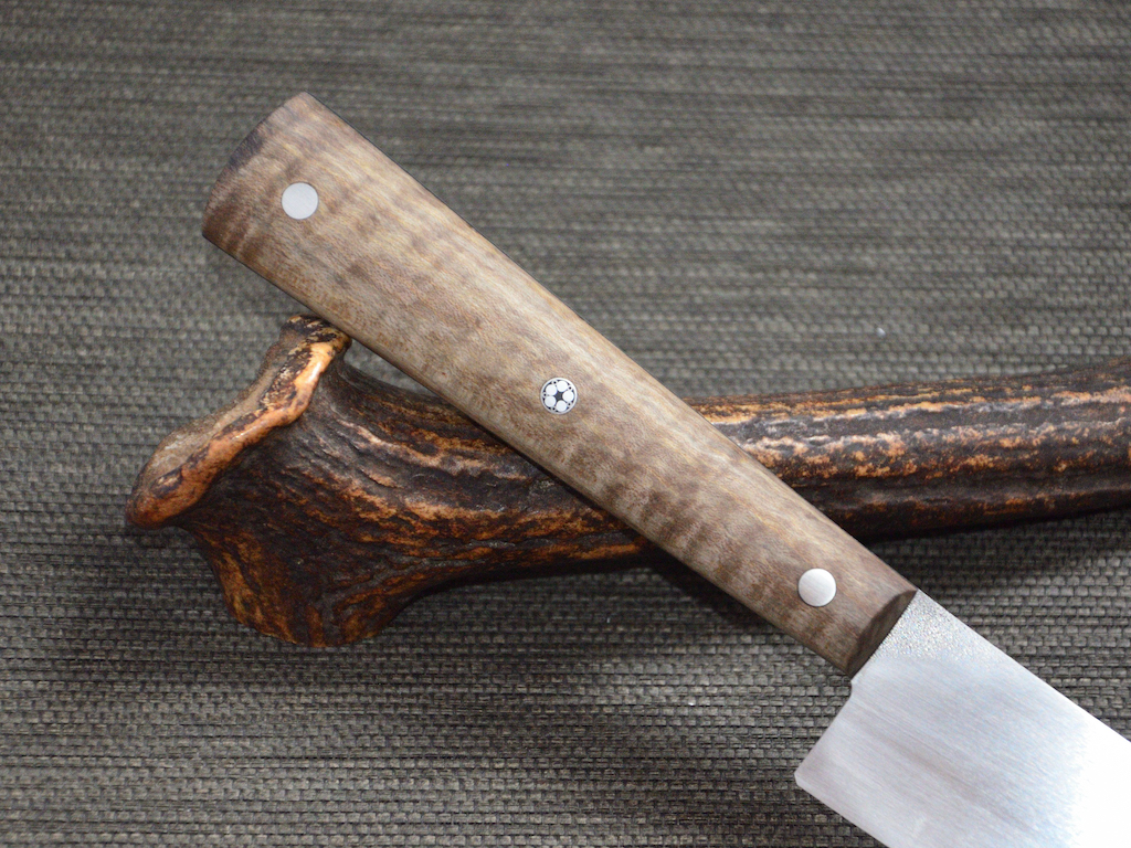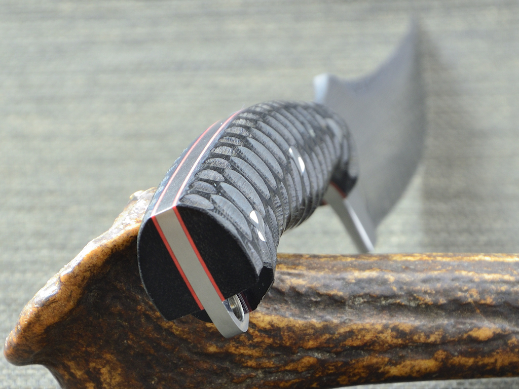 Griff: Gestocktes Ahorn welches ich grau eingefärbt und stabilisiert habe, schwarzes Fiber, Edelstahl Pins sowie ein Mosaikpin. Am Messer wirkt die graue Einfärbung eher bräunlich, sieht wie ich finde aber ganz gut aus.