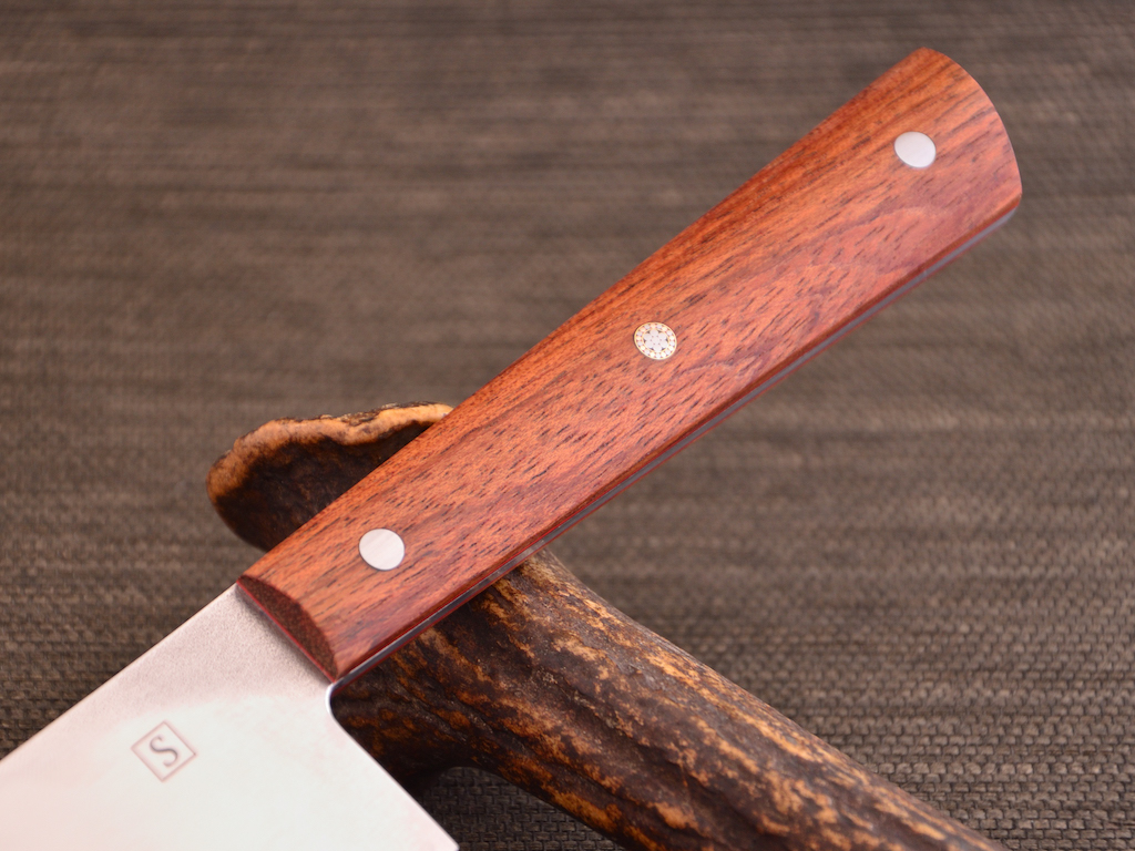 Das Holz ist hart und dicht und auch recht schwer. Mein Stück hatte eine Dichte von 840 kg/m3, das ist im Bereich von Bankirai oder Ipe. Das Holz lässt sich gut bearbeiten. Beim schleifen brennt und schmiert es allerdings leicht, man muss das Band oft abziehen und langsam mit wenig Druck schleifen. Leider habe ich nichts mehr. Es hat genau für diese drei Messer gereicht. Ich habe das Holz nicht stabilisiert.