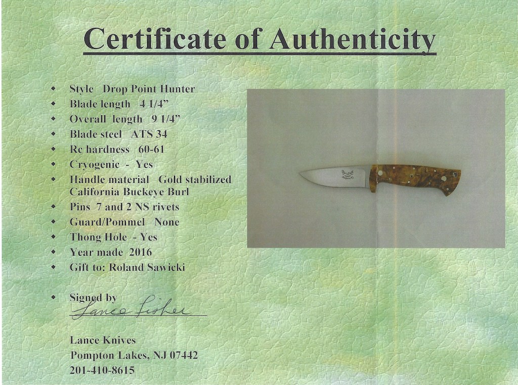 Nun zu diesem Messer. Lance stellt immer ein Zertifikat das zeigt alles über die verwendeten Materialien. Ich hänge das hier einfach an.