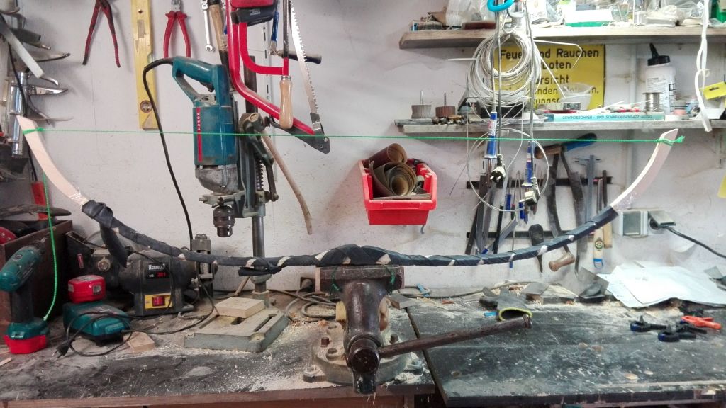 Ich mache die Wicklungen immer bei der ersten Lage, so kann ich die Sehnenschicht zum Schluß schleifen oder die Schicht dünner machen , wenn der Bogen zu stark geworden ist.