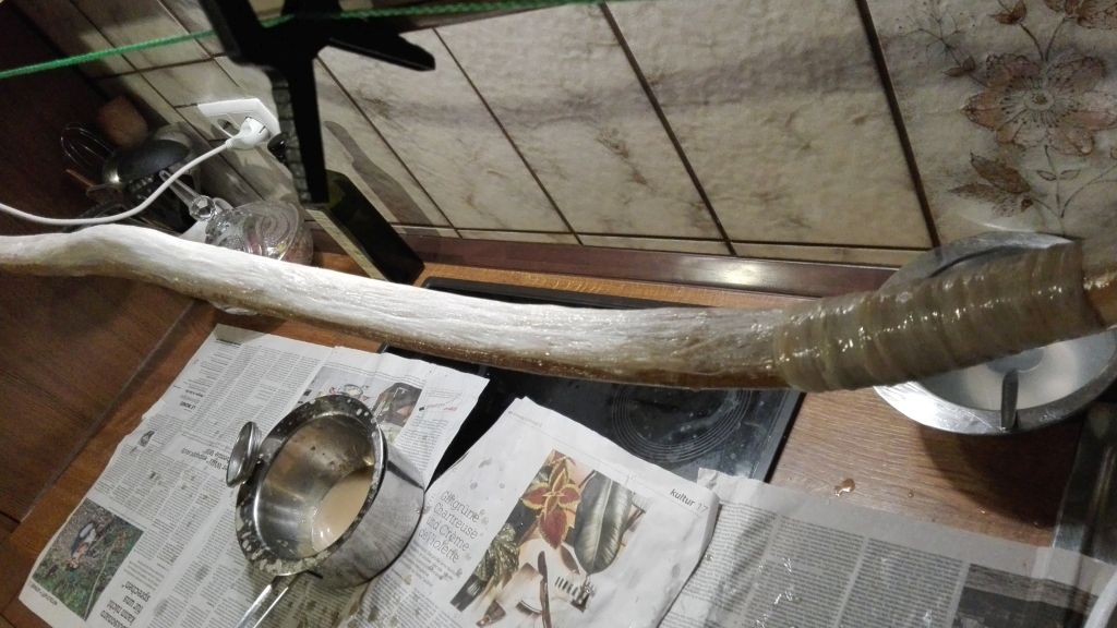 Heute bekam der Assyrer seine 1. Sehnen Schicht. Wie immer erst mit 10%tigem Hautleim grundieren und mit 25%tigem Hautleim die Sehnen aufbringen. Gestern bekam er die endgültige Form, dabei habe ich festgestellt, dass der Bogen sich leicht zu Seite verzieht. Nachdem er mit Hosengummis umwickelt wurde, habe ich ihn so fixiert , dass er gerade bleibt und so kann er nun trocken. Sollten Druckstellen entstehen kann ich die mit den nächsten 2 Schichten wieder ausgleichen. Ist auf jeden Fall besser als ein verzogener Bogen.