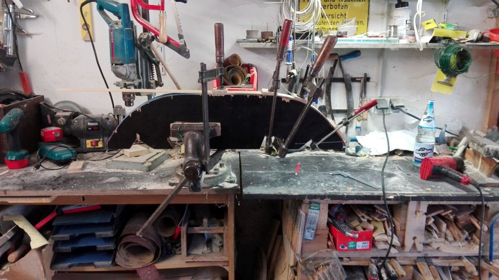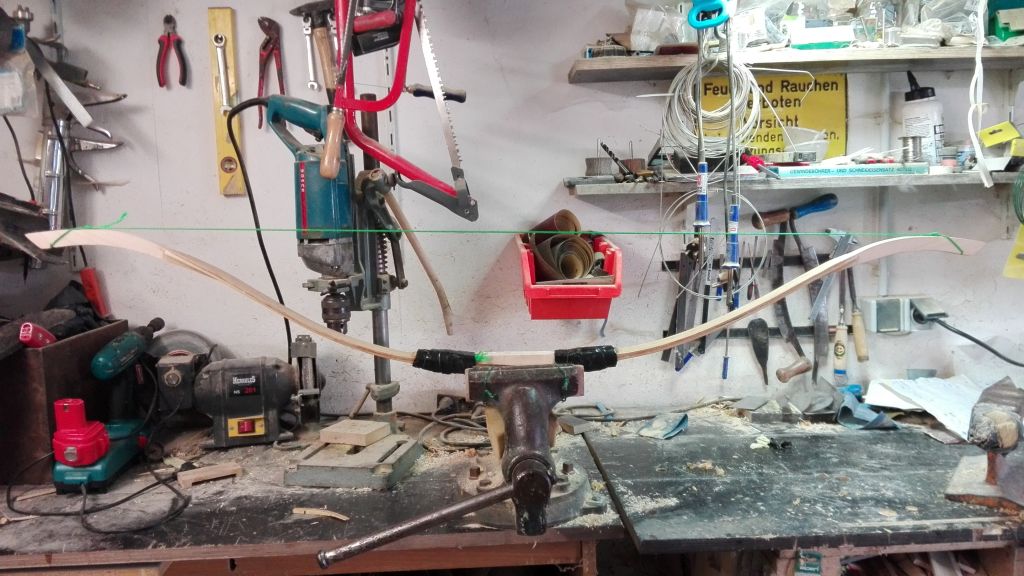 Ich mache die Wicklungen immer bei der ersten Lage, so kann ich die Sehnenschicht zum Schluß schleifen oder die Schicht dünner machen , wenn der Bogen zu stark geworden ist.