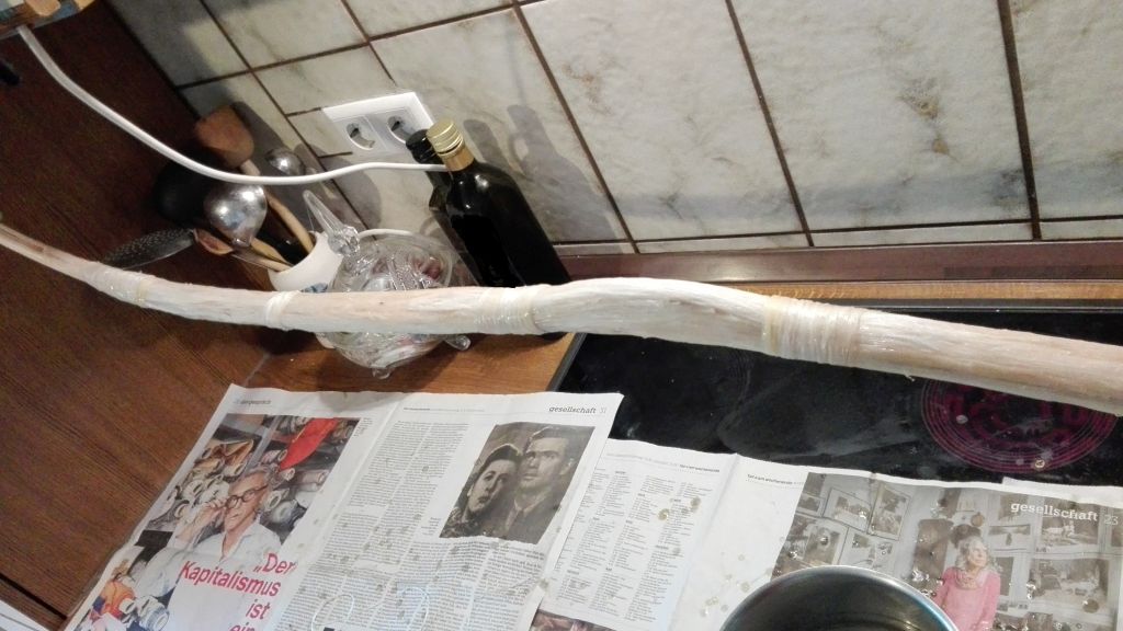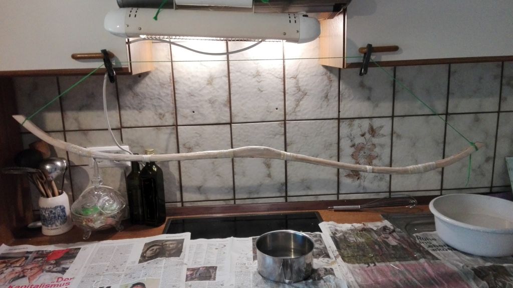 Heute bekam der Assyrer seine 1. Sehnen Schicht. Wie immer erst mit 10%tigem Hautleim grundieren und mit 25%tigem Hautleim die Sehnen aufbringen. Gestern bekam er die endgültige Form, dabei habe ich festgestellt, dass der Bogen sich leicht zu Seite verzieht. Nachdem er mit Hosengummis umwickelt wurde, habe ich ihn so fixiert , dass er gerade bleibt und so kann er nun trocken. Sollten Druckstellen entstehen kann ich die mit den nächsten 2 Schichten wieder ausgleichen. Ist auf jeden Fall besser als ein verzogener Bogen.