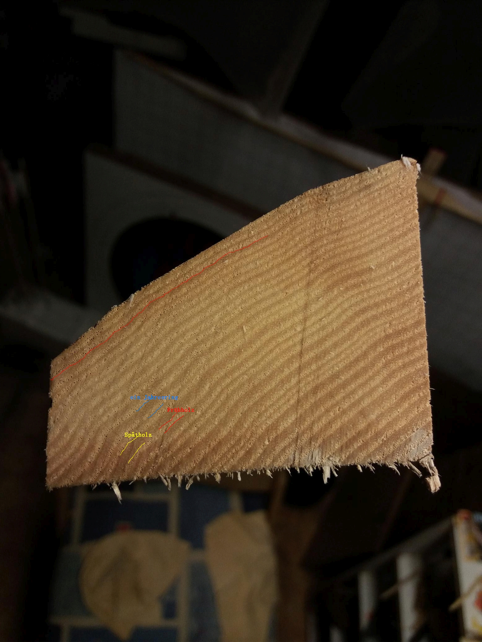 Erwähnen sollte ich, dass die Fläche auf der die Zollstöcke platziert sind, zur Rückenfläche in etwa in einem Winkel von 120 ° steht. Demnach erscheint natürlich der gewünschte Spätholzring auch breiter. Wie er weiter zur Mitte des Rückens verläuft, lässt sich nur erahnen. Hoffentlich bleibt da noch genügend Holz übrig... ???
