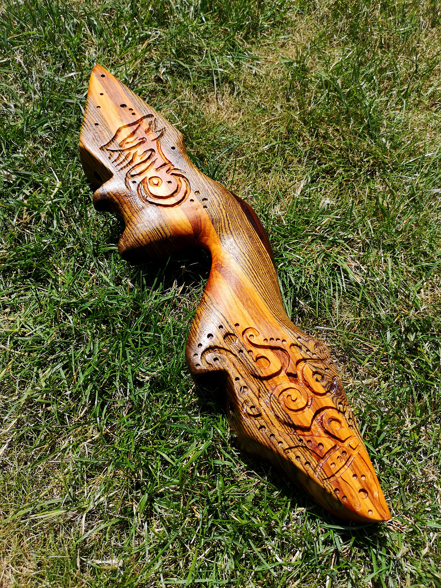 Ansonsten sieht man noch überall Werzeugspuren - da steckt meines Erachtens nach noch ordentlich Schleif- und Finish-Arbeit drin. Was die Gravuren angeht: die untere ist ganz OK, die obere finde ich schrecklich (Sorry). Bei beiden habe ich den Dremel-Aufsatz förmlich vor Augen, wie er sich durch das Holz wurlt... Ich benutze ja auch einen Dremel zum Schnitzen, aber die Konturen werden dann nochmal mit Hand-Schnitzwerkzeug nachgearbeitet und begradigt. Das würde ich Dir auch empfehlen.