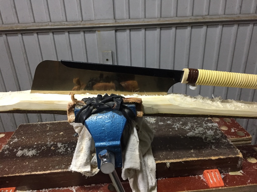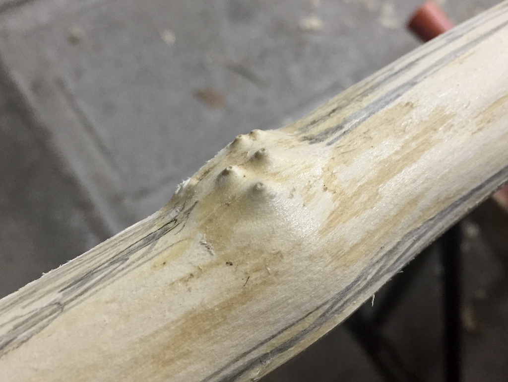 Den Holler habe ich heute mit Ziehmesser und Raspel ganz grob in Form gebracht um das Trocknen zu beschleunigen. Die Knubbel im Biegebereich können spannend werden. Momentan wiegt er noch 880 Gramm.