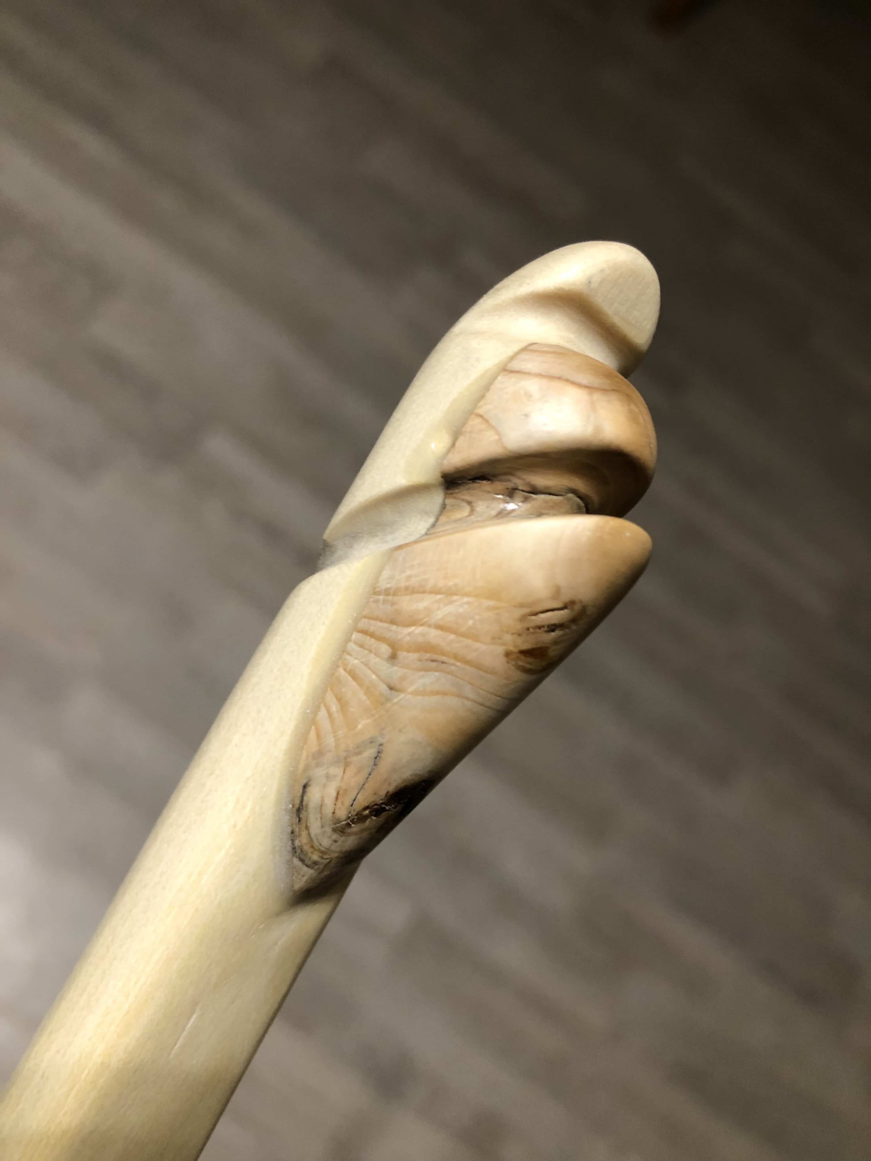Und dann, den vorliegenden Fall betreffend, war das so, dass ich vergangenen Sommer im Wald eine Wurzelholz-Knolle gefunden hatte. Lag einfach so da rum. Tolles Teil. Ungefähr so groß wie ein Hühnerei, nur unregelmäßiger geformt. Rundum gleichmäßige Oberfläche, ich weiß nicht, wo und wie das Ding mal angewachsen gewesen sein soll. Jedenfalls habe ich die Knolle mitgenommen, klar, und erstmal mit dem feinsten greifbaren Schleifpapier richtig schön samtig geschliffen und eingeölt. Lag lange auf meinem Schreibtisch, quasi als Handschmeichler.