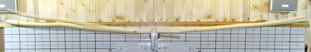 Der Rohling hat in jedem Wurfarm einen ungünstig gelegenen Totast im Biegebereich. Im weiteren Verlauf werde ich diesen wohl mit einem hierauf dressierten großen nachtaktiven Waldvogel auf den Pelz rücken