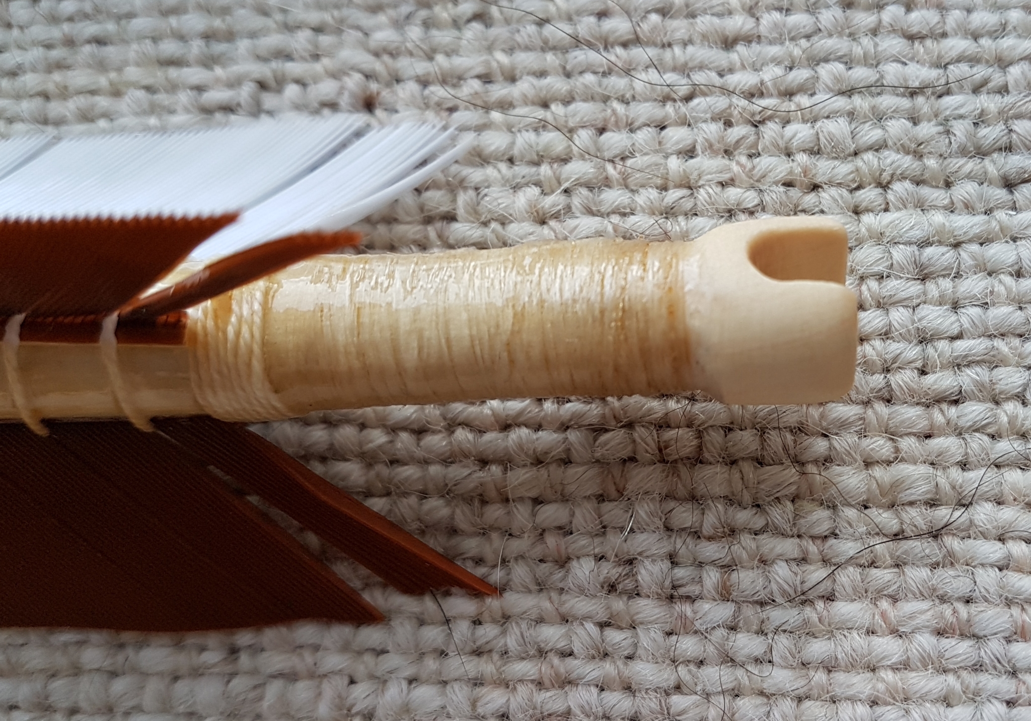 Die Federn sind Truthuhn, mit Hautleim geklebt und etwas dickerem Leinenzwirn (zu Testzwecken) als ich normalerweise nehmen würde gewickelt. Alle Klebestellen und die Wicklung sind mit einer Schellack-Benzoe-Mischung versiegelt. Außerdem sind die Pfeile noch 2x geölt und werden noch mit meiner Standard Wachs-Harz-Mischung versiegelt.