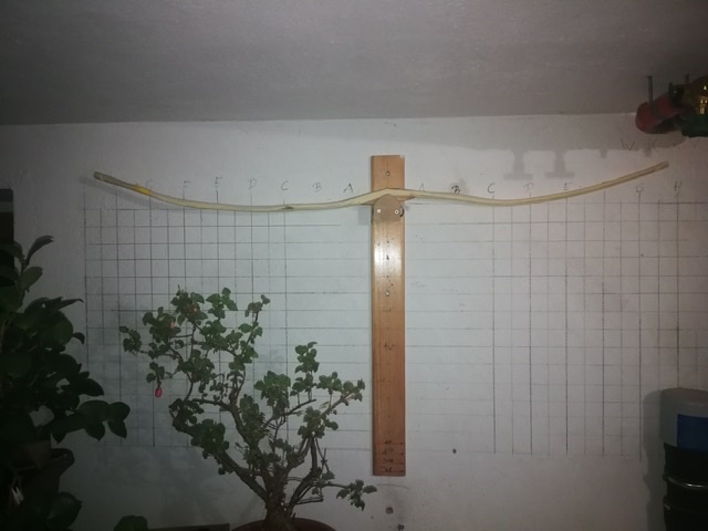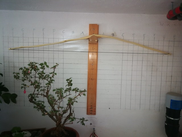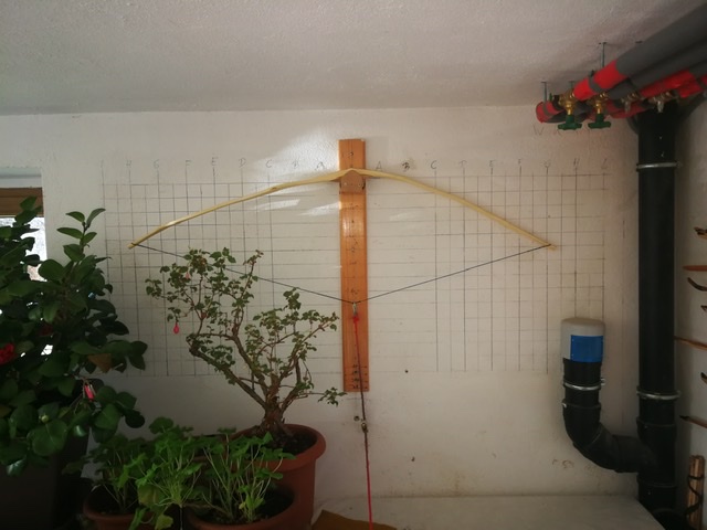 Ich würde ihn erst so vortillern , dass die Arme sich sauber abrollen zu einer Linie(siehe grün). Danach kannst du ihn auf Standhöhe aufspannen. Ich würde ihn auf 1,65cm kürzen, das reicht locker bei deinem Auszug.(da hast du noch genug platz um nochmals zu kürzen). Danach musst du nur noch die Wurfarme leicht ihn Biegung bringen (siehe PDF).
