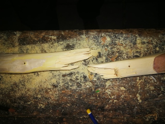 Ja, das hatte ich bei meinem ersten Bogen, einem Hasel-ELB, auch. Da war bis relativ zum Endfinish hin noch recht viel Bast drauf. Als ich ihn das erste mal probeweise etwas weiter ausgezogen habe, hat es zweimal so laut geknackt, dass ich den Bogen (jetzt wird‘s ein wenig peinlich) hingeschmissen und rumgeschrien habe... :D Da hatte ich ja noch überhaupt gar keinen Plan vom Bogenbau, also war ich fest davon überzeugt, dass er an min. zwei Stellen angebrochen war. Ich konnte allerdings die gerissenen Stellen im Bast finden.