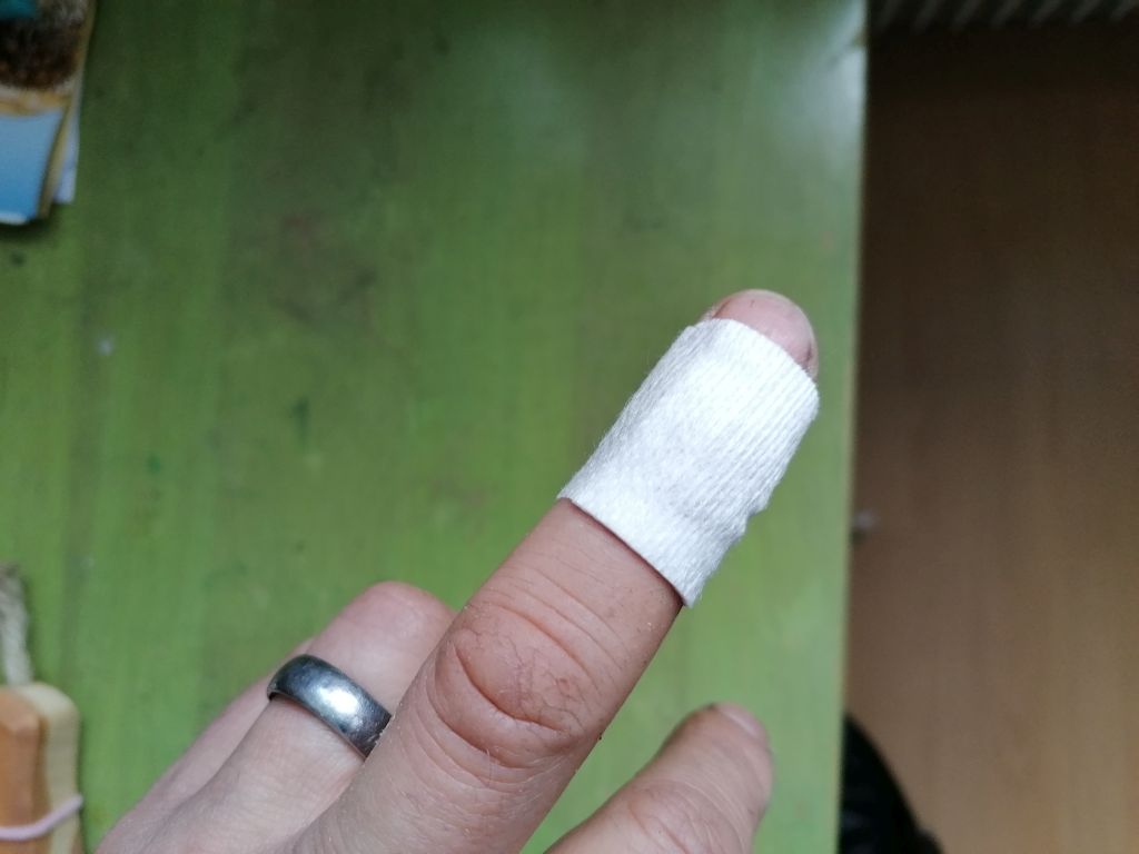 So heute hat´s mich auch mal wieder erwischt ::) Beim Löscher erweitern mit meiner Stechahle bin ich auf einmal durch das Material gerutscht und in dem Winkel (siehe Bild) in mein Mittelfinger gerutscht. Das sah mit durchgesteckter Ahle schlimmer aus und das wollte ich euch nicht zumuten ;D . Ich hatte Glück, dass ich den Finger seitlich von der Innenseite durchstochen habe, sonst hätte ich das Gelenk erwischt oder eine Sehne. Ich kann alles ohne Schmerzen bewegen und habe direkt die Wunde gesäubert und die Blutung gestillt. Das Bild habe ich 20min. nach dem es passiert ist aufgenommen und ich habe so eine gute Wundheilung man sieht nicht mehr viel und die Wund ist bereits verschlossen. Betaisadona habe ich immer im Haus und ein Pflaster drauf alles Gut. Wie gut , dass ich mir die Ahle nicht komplett durch die Hand gestochen habe :)