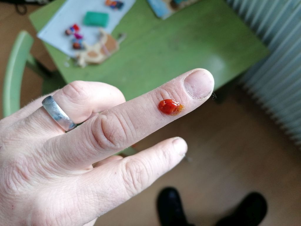 . Ich hatte Glück, dass ich den Finger seitlich von der Innenseite durchstochen habe, sonst hätte ich das Gelenk erwischt oder eine Sehne. Ich kann alles ohne Schmerzen bewegen und habe direkt die Wunde gesäubert und die Blutung gestillt. Das Bild habe ich 20min. nach dem es passiert ist aufgenommen und ich habe so eine gute Wundheilung man sieht nicht mehr viel und die Wund ist bereits verschlossen. Betaisadona habe ich immer im Haus und ein Pflaster drauf alles Gut. Wie gut , dass ich mir die Ahle nicht komplett durch die Hand gestochen habe