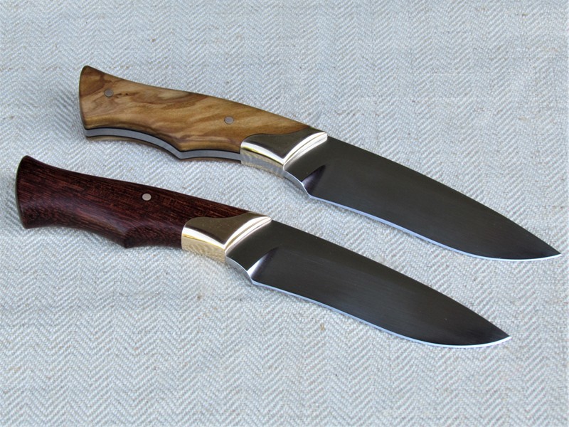 Die Bronzeelemente sind bei beiden Messern verlötet - bei der Flacherlversion zusätzlich blind vernietet. Die Klingen sind bis Korn 800 geschliffen und leicht poliert - naja, eigentlich steh ich nicht auf Poliertes, aber bedingt durch die verlöteten Bronzeelement schien mir das einfacher.