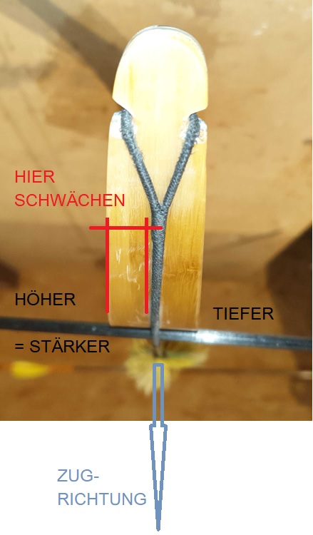 Denken wir uns die Sehne mal als UNTEN, so, als würdest Du den Bogen ziehen, indem Du mit dem Fuß in die Sehne trittst und dem Bogen dann anhebst...