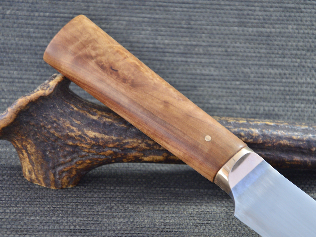 Der Griff ist aus stabilisiertem Birnenholz der Pin ebenfalls aus Bronze.