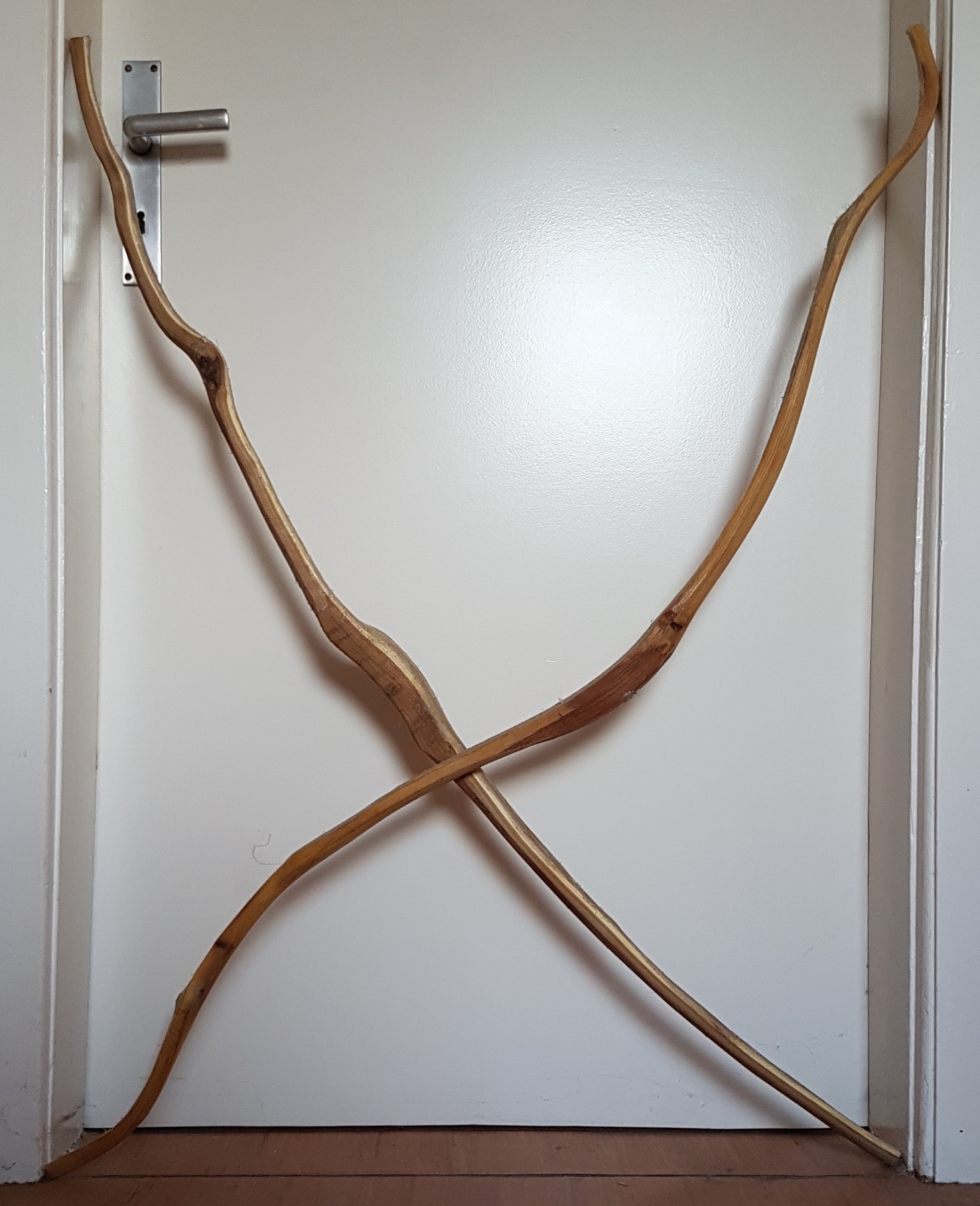- Zwei schräge Staves dene ich zur Zeit versuche je einen Bogen zu entlocken. Osage und Goldregen ca.1,30m. Dauert noch ein bisschen. Aber so sehen sie schon mal nett aus. Leider haben beide schwierige Stellen die dagegen sprechen könnten dass die beiden wirklich mal Pfeile werfen können. Um die Lebenschancen zu erhöhen kommen Sehnen ins Spiel.