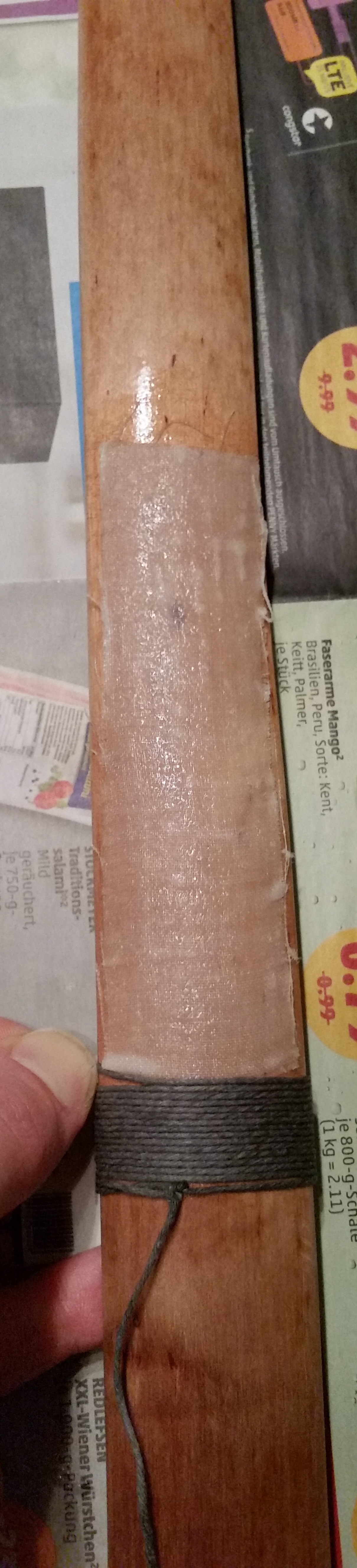 Die Reparatur lief gestern ganz gut glaube ich. Ich habe unter den Span ein wenig Uhu Endfest geschoben und eingefönt und dann beidseitig auf gleichem Abstand und gleicher Länge einen Streifen Leinenstoff aufgeklebt und die Stelle fest mit Hanfgarn umwickelt. (siehe Bilder)