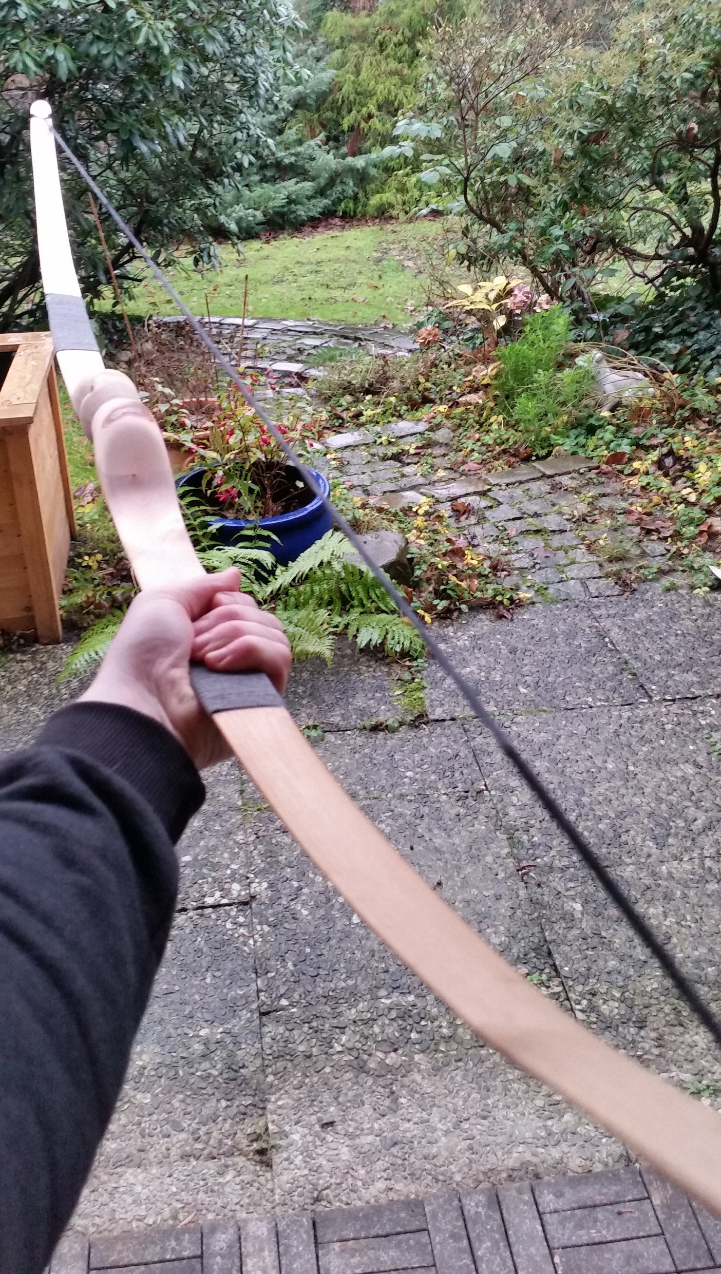Warum nicht einfach den oberen Arm schwächer machen? Ich habe jetzt schon Sorge, den maximalen Auszug von 27" nicht zu erreichen, weil ich die Wicklungen ja nicht mehr schwächen kann. Vor der Reparatur war ich schon auf 30# bei 24", d.h. mir fehlen noch 3-4" und mit der Zugkraft möchte ich bei dem Holz eher auf 25# oder 20# runter. Wenn ich jetzt kürze, wird es doch noch schwerer auf die 27" zu kommen.