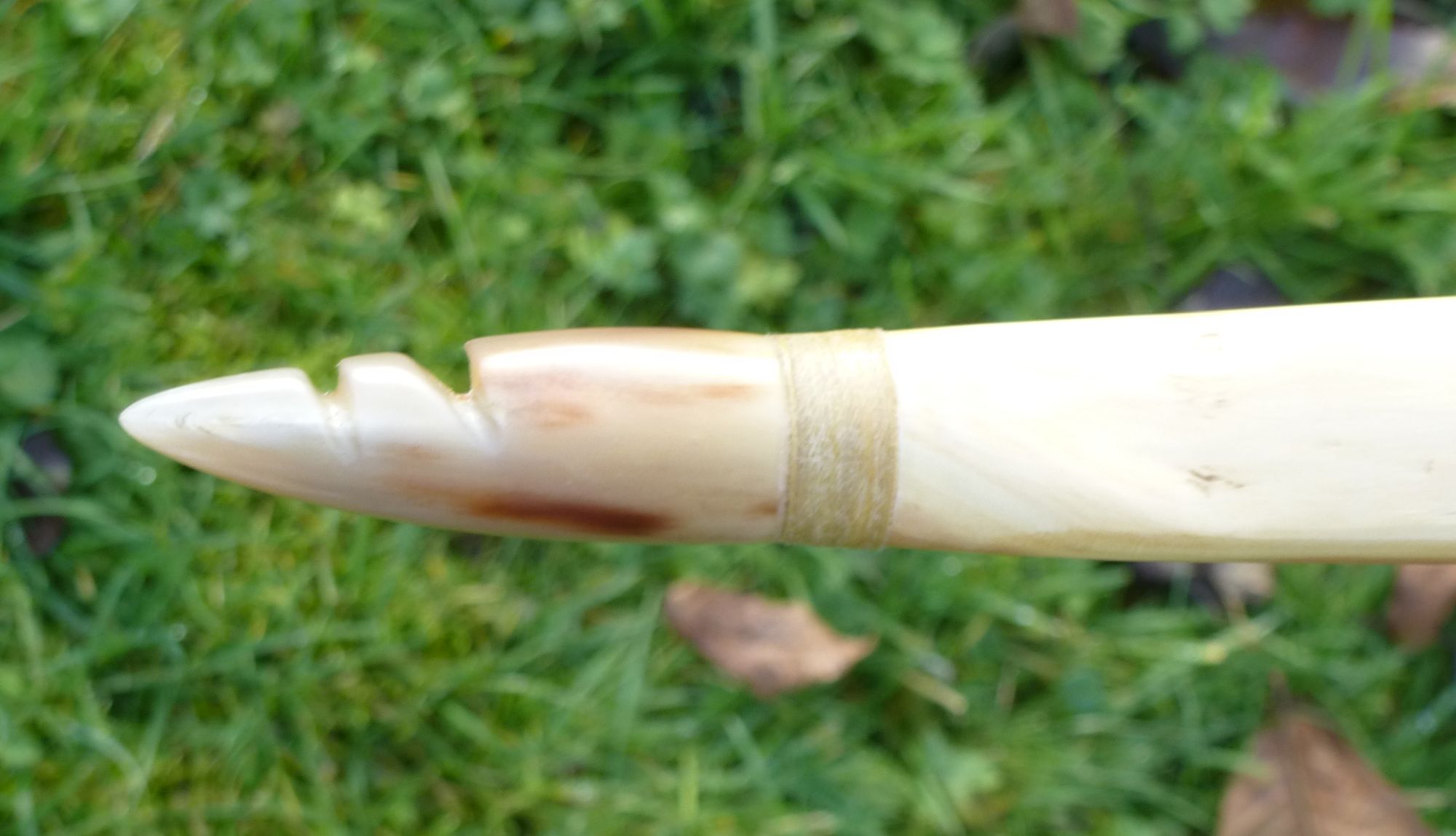 Deshalb sind nur 2 Splintringe erhalten geblieben, aber die sind je 1,5mm dick. Dadurch ist auch der Markkanal weitestgehend noch im Bogen. Das Kernholz ist eher hell. An den Aststellen hab ich ihn breiter gelassen und zwei Stellen mit eingewachsener Rinde mit dem Dremel ausgebohrt und mit Epoxy gefüllt. Für die Sehnenlage mußte ich dreimal dampfbiegen. Ursprünglich hatte der Bogen durch den Knick im Griff 2,5cm Deflex, der ist jetzt auf 4,5cm angewachsen. Vor den Nocken aus blondem Kuhhorn ist eine Leinen-Wicklung, da die Jahresringe (siehe Foto) Richtung Rücken auslaufen. Grund war eine Gabelung (oben) bzw. ein Ast (unten), die ich zwar hätte absägen können, aber das hätte 10cm gekostet.