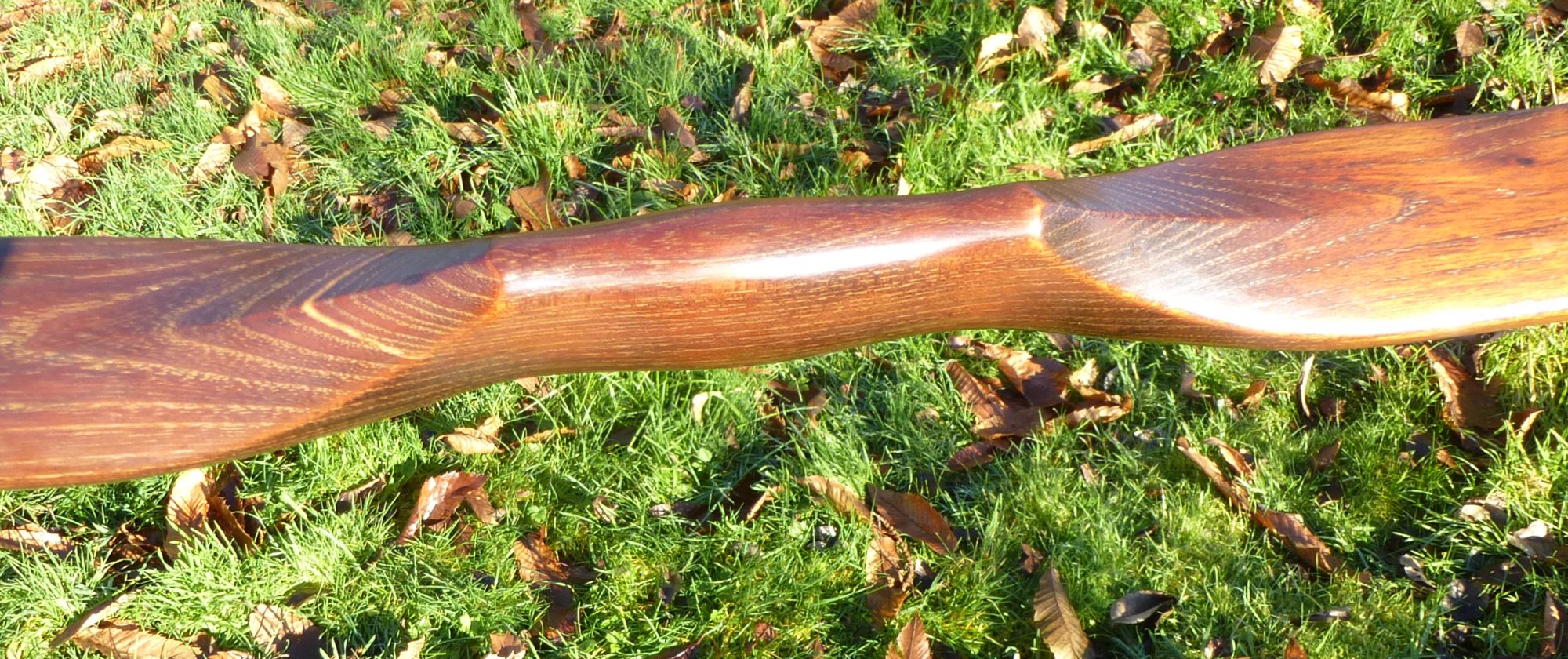 aus ungarischer Osage mit einem dogleg. Etwas Charakter und Twist habe ich mit dampfbiegen entfernen können und die Enden leicht geflippt. Das Hundebein bin ich trotz einiger Versuche nicht losgeworden, der Osage war äußerst unwillig. Am Ende 6 Tage geräuchert, dann mit Tungöl und gelbem Pigment behandelt und mit Schellack versiegelt. Durch das Pigment werden die Jahresringe schön betont.
