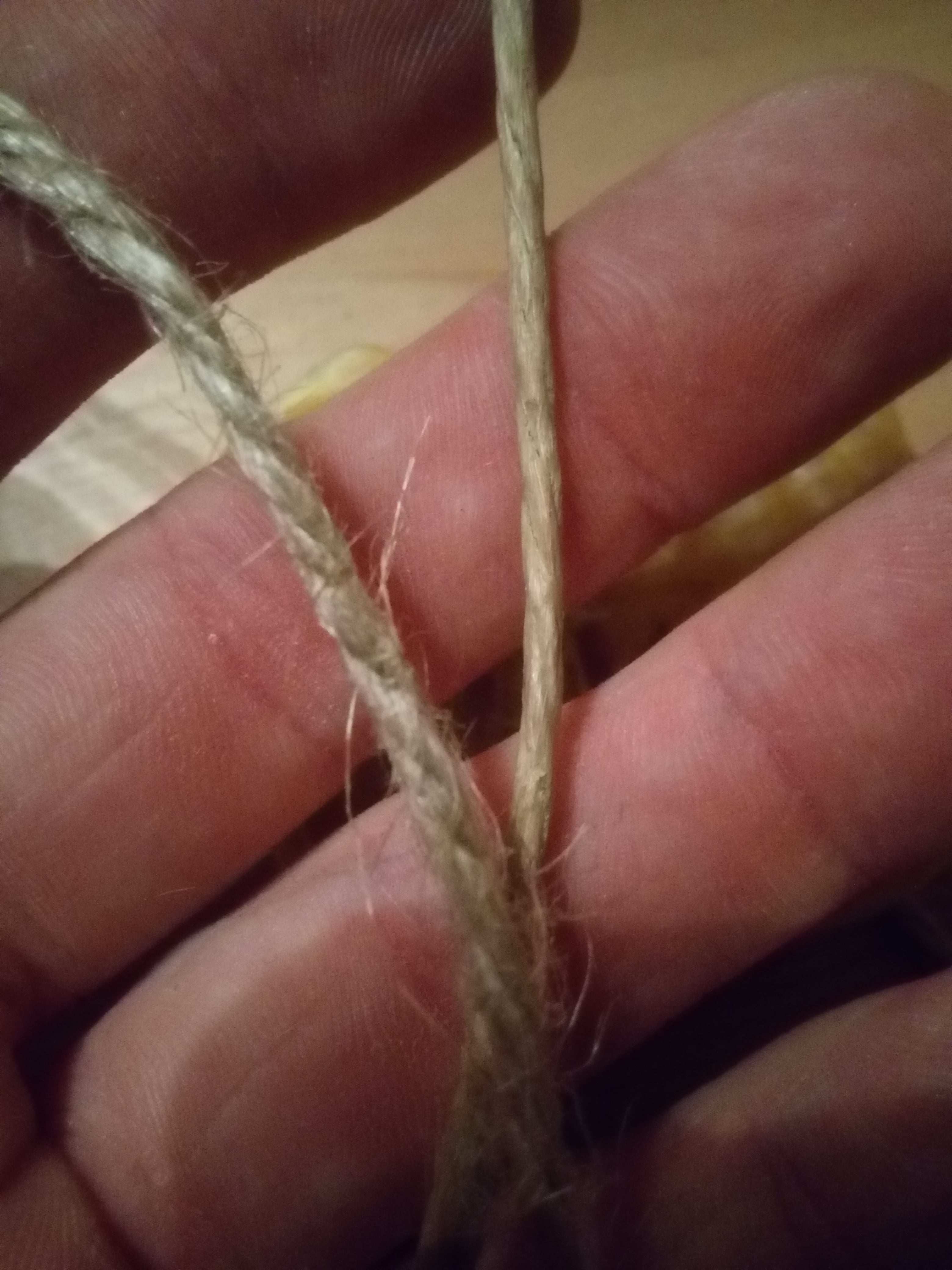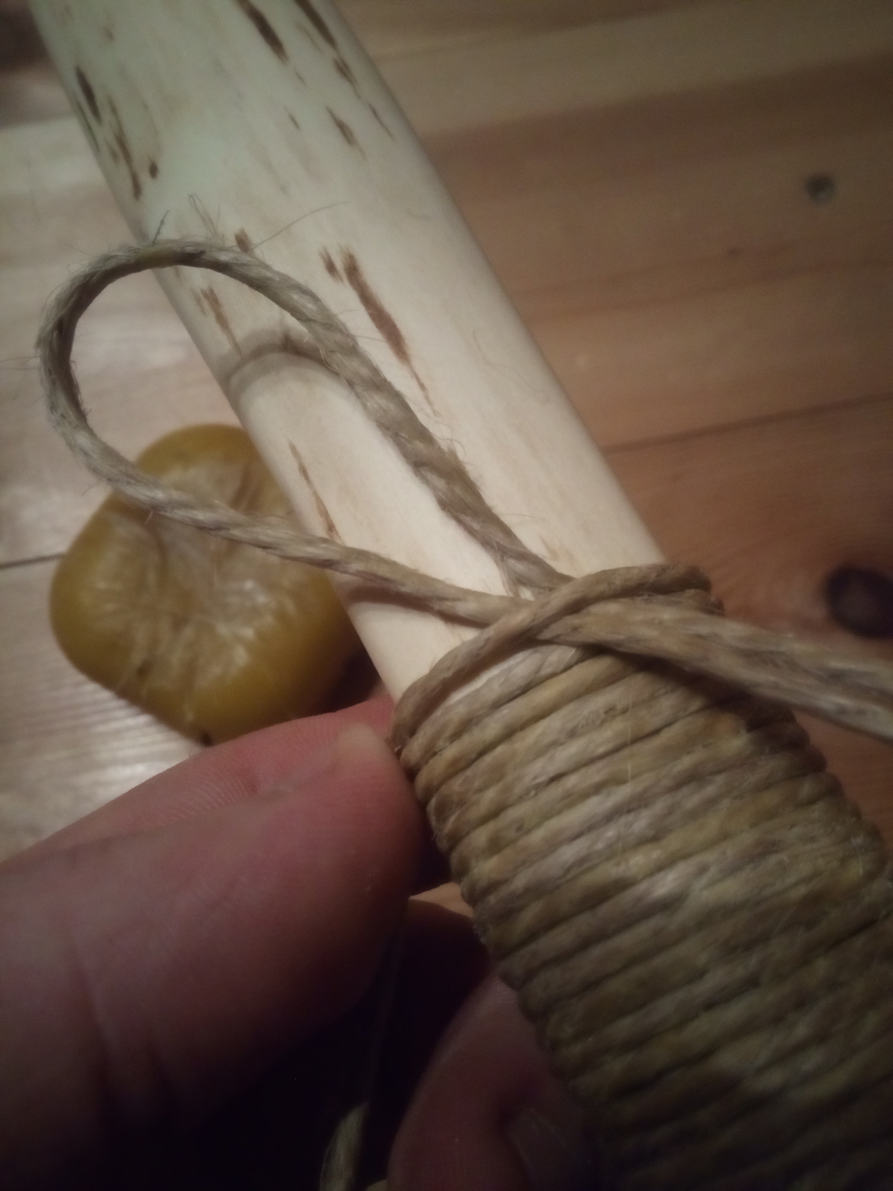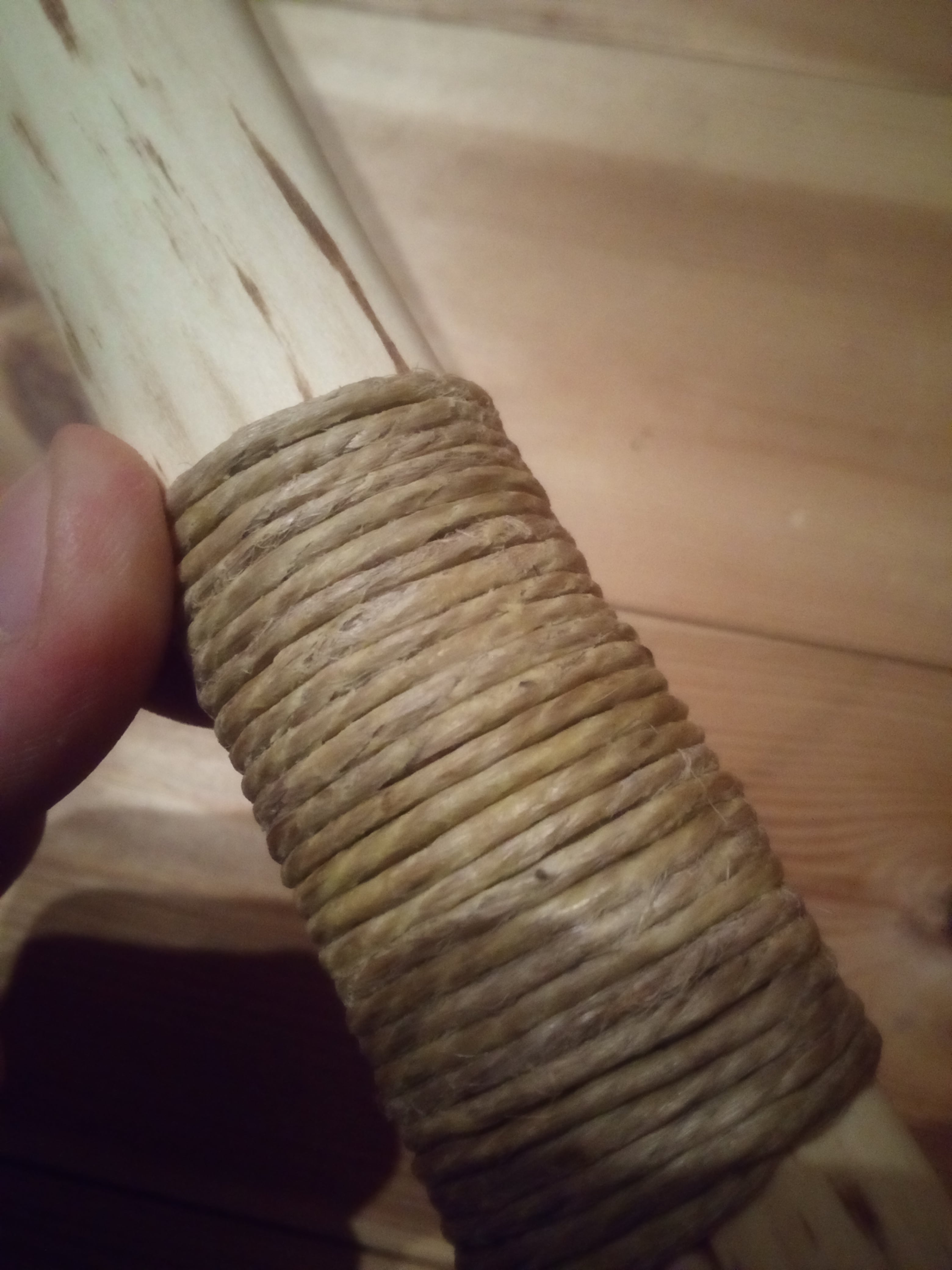 Ich habe mich gestern Nacht noch spontan für eine Griffwicklung entschieden. Ich hatte noch ein etwa 3mm starkes (Jute?)-, oder so ähnlich, Garn herumliegen. Gewachst fusselt das auch nicht und gibt einen leicht klebrigen, rutschfesten Griff.