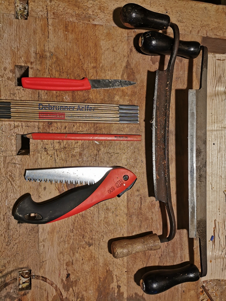 Der Bergahorn ergab zwei Stücke eines ist noch nicht entrindet, einen zusätzlichen Hasel liegt auch noch bei, ebenfalls nicht entrindet. Die zwei Hollerstücke habe ich mit der BS geteilt. Enden sind versiegelt und alle warten geduldig bis sie wieder unter s Messer dürfen