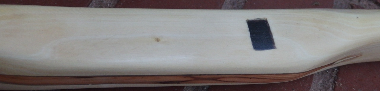Danach habe ich vorgestern und gestern Sonderschichten eingelegt, um den Bogen fertig zu bekommen. Das Tillern zog sich hin. Da der Bogen nur links direkt am Griff einen reflexen Knick hatte, habe ich den Griff links leicht dünner gemacht, damit quasi ein Reflex direkt nach dem Fadeout auf beiden Seiten ist. Rechts war direkt nach dem Fadeout zuwenig Holz, daher musste ich den ganzen Wurfarm schwächen und den linken auch. Ein Tempern an der Stelle half noch zusätzlich. Die Enden sind steif. Weil die Mitte des Wurfarmes zu stark war, habe ich außerdem vom halbpyramidalen auf vollpyramidales Design gewechselt. Dann noch Nocken in Form gebracht, Sehne gebaut, am Griff Holzinlays statt der blöden Weißleim/Holzpaste verwendet, Arrowpass aus Horn rein und ab zum Einschießen.