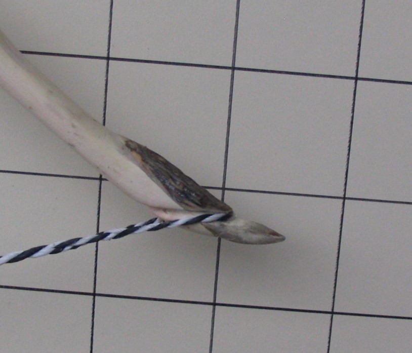 Ach ja die kleine Faulstelle vom Anfang konnte ich ganz runterarbeiten , und der Totast am oberen Wurfarm konnte ich auch so weit rausarbeiten , daß sie nicht mehr relevant ist. Man sieht nur noch ein kleines Löchlein. Die Auflagen für die Nocken habe ich aus Rehgeweih gemacht und mit wasserfestem Holzleim drauf geleimt. Sehnenlage ist leicht nach links versetzt, was aber nicht weiter schlimm ist da ja die Pfeilauflage auch links am Bogen ist. Bin momentan bei ca. 55 cm Auszug und 40 bis 45lb' s und einem Gewicht von ziemlich genau 700 g,