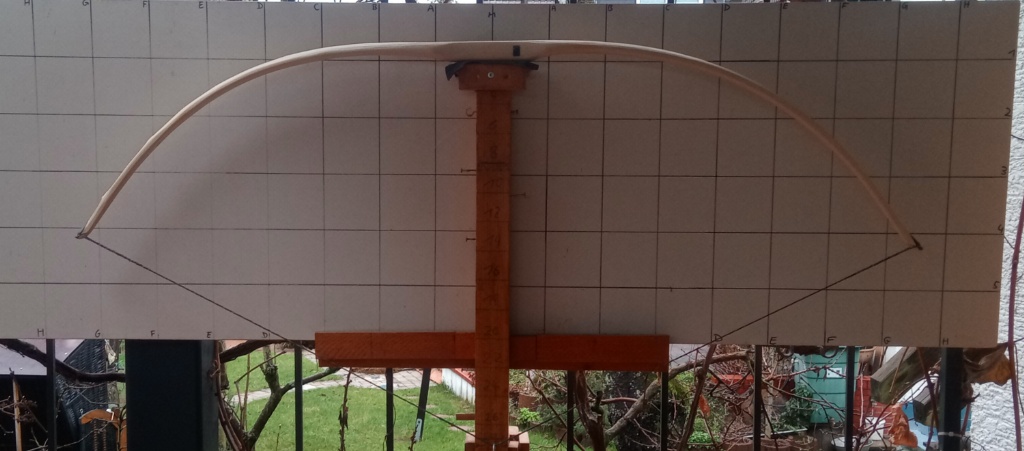 Und Plan C (der obere Teil des Hasels) habe ich noch die Dicke angepaßt, Sehnenkerben gemacht, dann Bodentiller, dann mal mit Sehne drauf seitlich der Hüfte gebogen, dann auf Tillerbaum. Am Bogen würde ich sagen links bei D muss noch ein Hauch weg. Wahrscheinlich wenn die Sehne kürzer wird biegt's außen mehr. Ich brauch schon etwas Kraft, um den zu ziehen, der hat noch (Wurfarmdicke nach Fadeout ca. 2,4-2,5cm). Stärke schätzen ist so eine Sache...