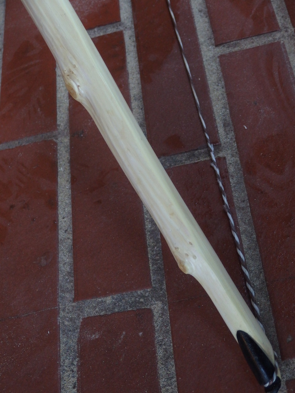 Danach habe ich vorgestern und gestern Sonderschichten eingelegt, um den Bogen fertig zu bekommen. Das Tillern zog sich hin. Da der Bogen nur links direkt am Griff einen reflexen Knick hatte, habe ich den Griff links leicht dünner gemacht, damit quasi ein Reflex direkt nach dem Fadeout auf beiden Seiten ist. Rechts war direkt nach dem Fadeout zuwenig Holz, daher musste ich den ganzen Wurfarm schwächen und den linken auch. Ein Tempern an der Stelle half noch zusätzlich. Die Enden sind steif. Weil die Mitte des Wurfarmes zu stark war, habe ich außerdem vom halbpyramidalen auf vollpyramidales Design gewechselt. Dann noch Nocken in Form gebracht, Sehne gebaut, am Griff Holzinlays statt der blöden Weißleim/Holzpaste verwendet, Arrowpass aus Horn rein und ab zum Einschießen.