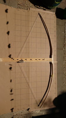 So begab es sich also, dass ich beim Grünschnitt im Garten vor zwei Jahren ein Ahornstämmchen in der Hand hielt, dass mich förmlich Anschrie, "BOGEN!!!!". Und so geschah es dann auch. Ohne jegliche Kenntniss habe ich mein erstes Stück Feuerholz produziert. Streng genommen könnte es als zweiter Bogen gelten, da ich auch in meiner Jugend bereits einmal einen guten alten Flitzebogen (einfacher Haselstamm mit der nächstbesten Schnur) "gebaut" habe. Aber zurück zu aktuelleren Ereignissen. Mit meinem ersten Ahorn bin ich doch recht zufrieden gewesen. Er kam auf etwa 6#@~28" bei einer Länge von ca 160cm. Überrascht hat mich dabei vor allem, wie viel Pappe so ein einfacher unangespitzter Pfeil aus einem Rundstab bei diesem "schwachen" Bogen so durchlöchert.