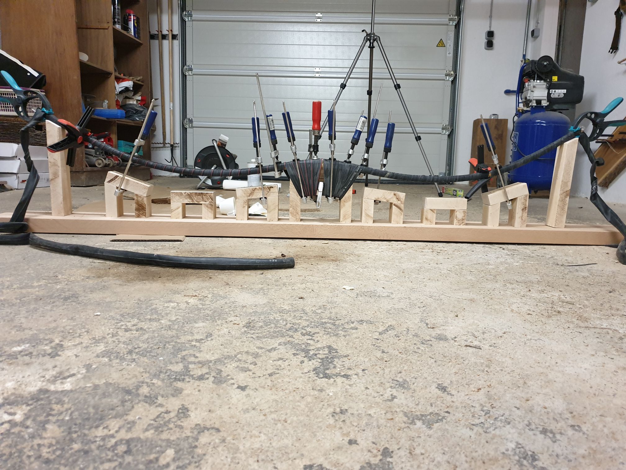 Ich hab den in einer variablen Biegeform gemacht. Die Laminate sind mit nem Fahrradschlauch umwickelt und das genaue Profil kann dann durch das anziehen der Schraubzwingen genau definiert werden. In dem Fall waren die Wurfarme "frei schwebend" aber beim nächsten mal würde ich mir abgerundete Distanzstücke zum unterlegen fertigen um ein seitliches wegkippen des Wurfarms zu vermeiden.