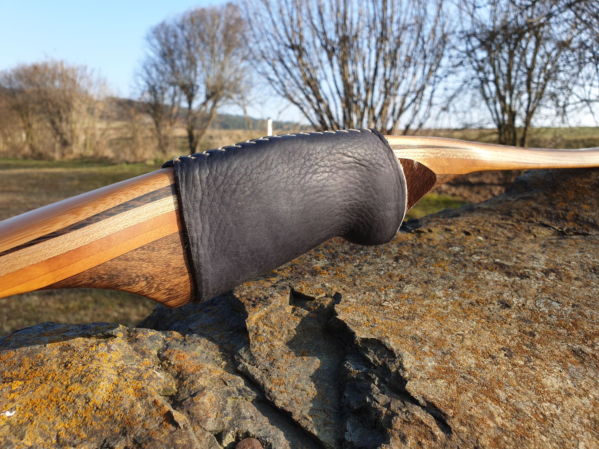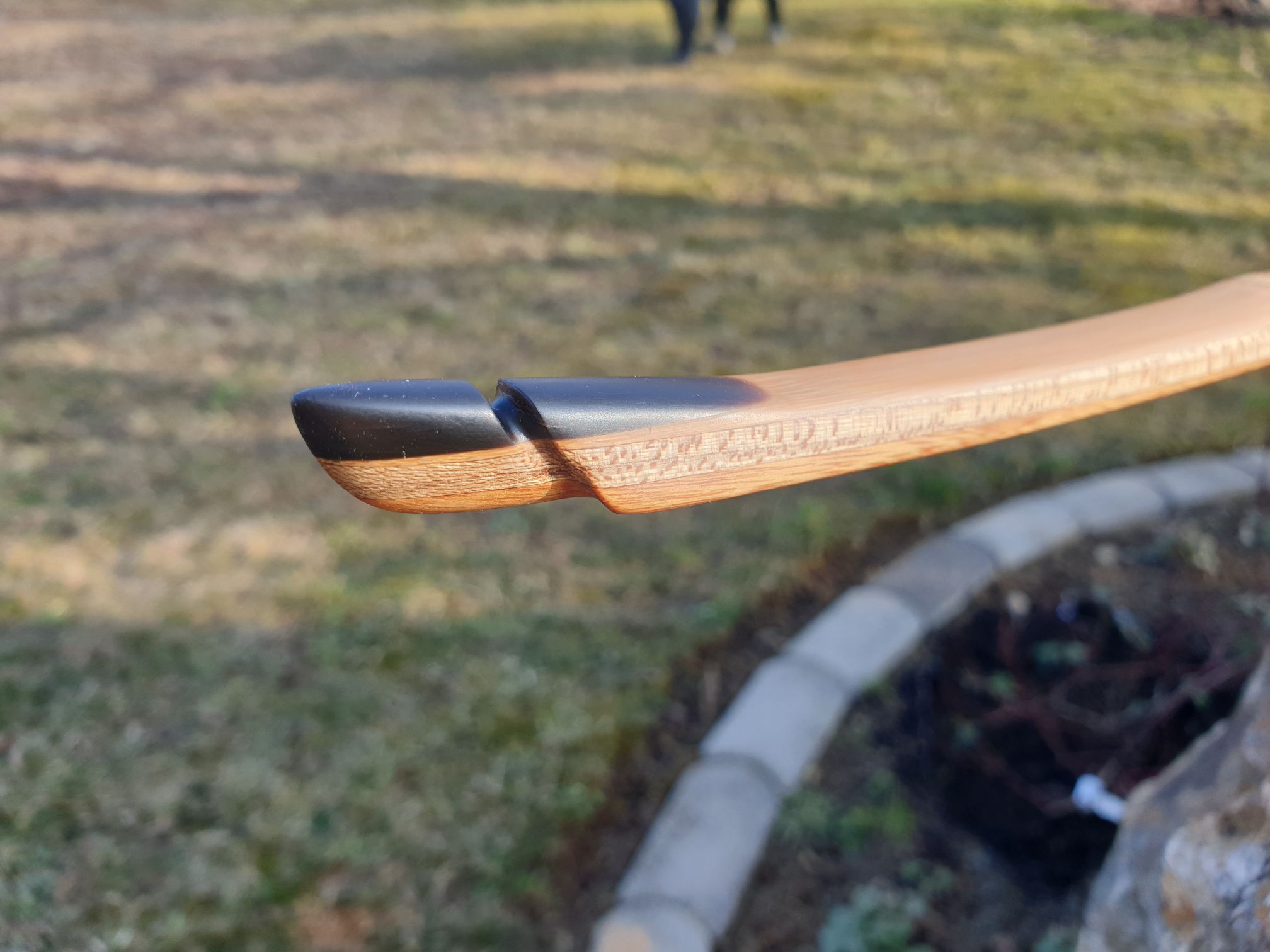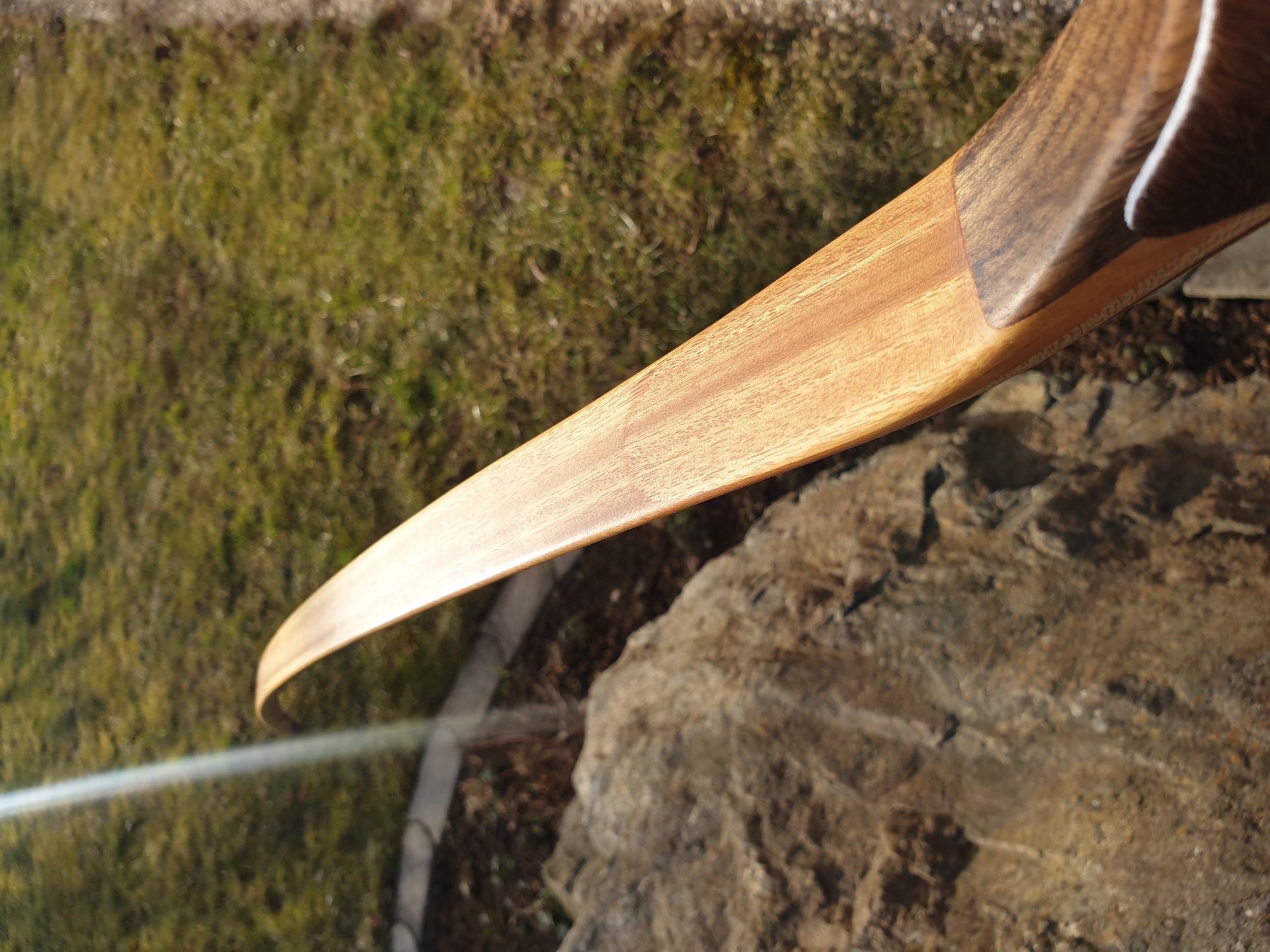 Die Länge beträgt Nock to Nock 64" und er zieht auf meinen Auszug von 26,5" genau 40#. Die Wurfarme sind Pyramidal verjüngt und die Bauchseite ist um einiges Breiter als der Rücken. Beginnend mit 33mm am Bauch und 24mm am Rücken verjüngt er sich auf 12mm am Bauch und 8mm am Rücken. An der Nocke ist er somit auch 8mm breit. Dazu hab ich eine flämisch gespleiste Sehne mit 10 Strang Spectra die an den Öhrchen mit Dacron verstärkt ist. Die Standhöhe beträgt 6,5". Das Finish hab ich mit 800er Schleifpapier und Holzbalsam von Dick gemacht.