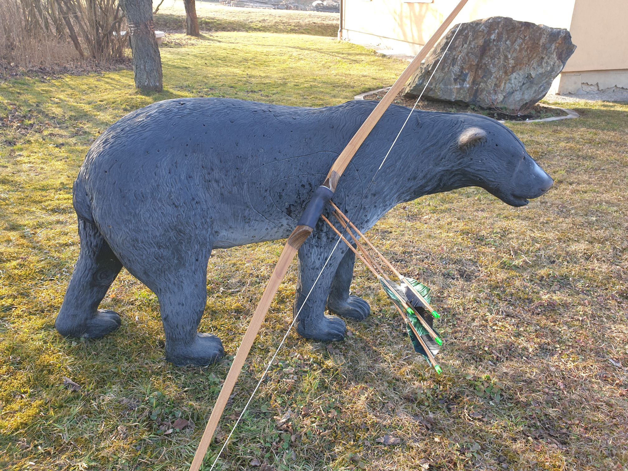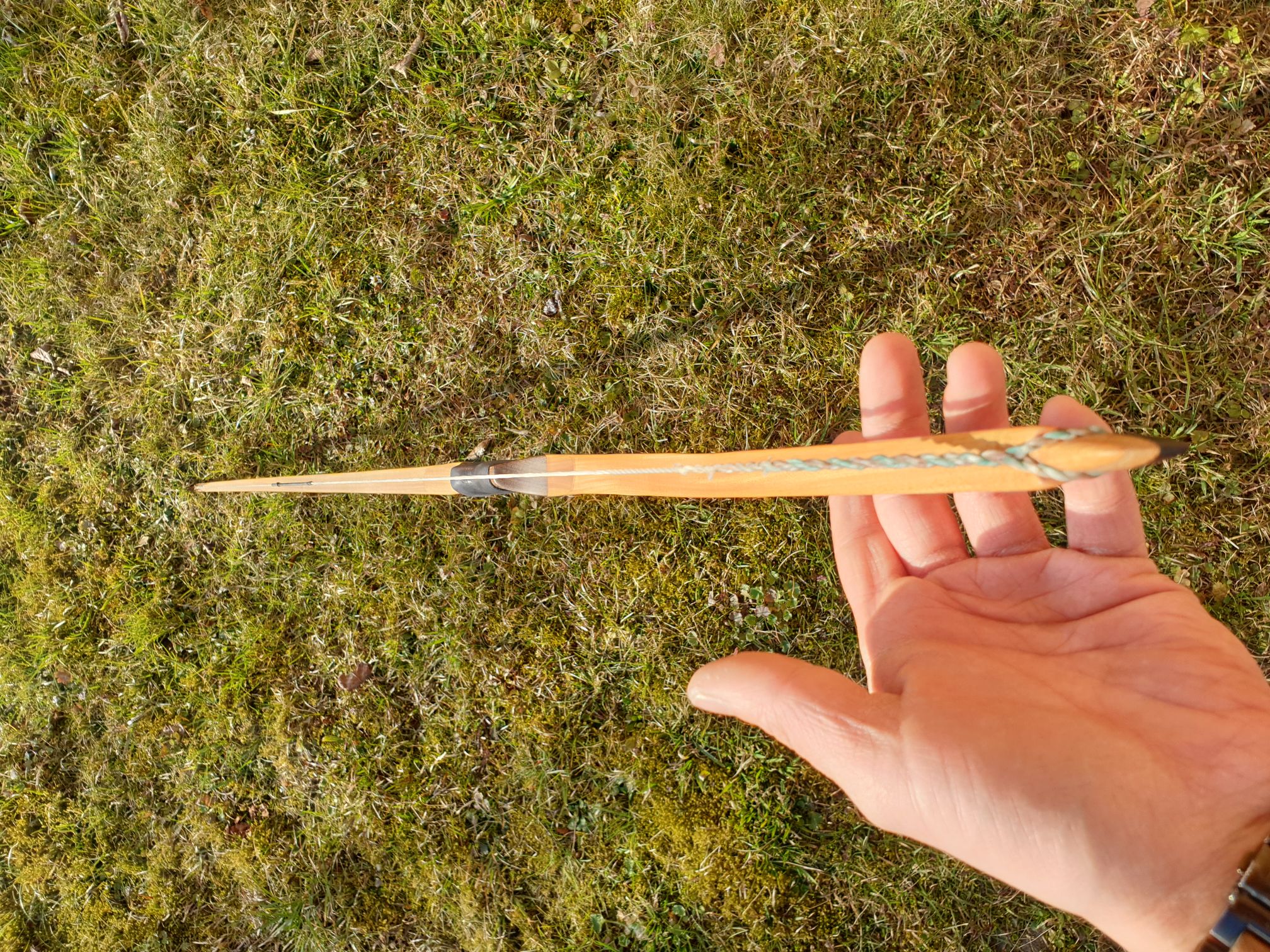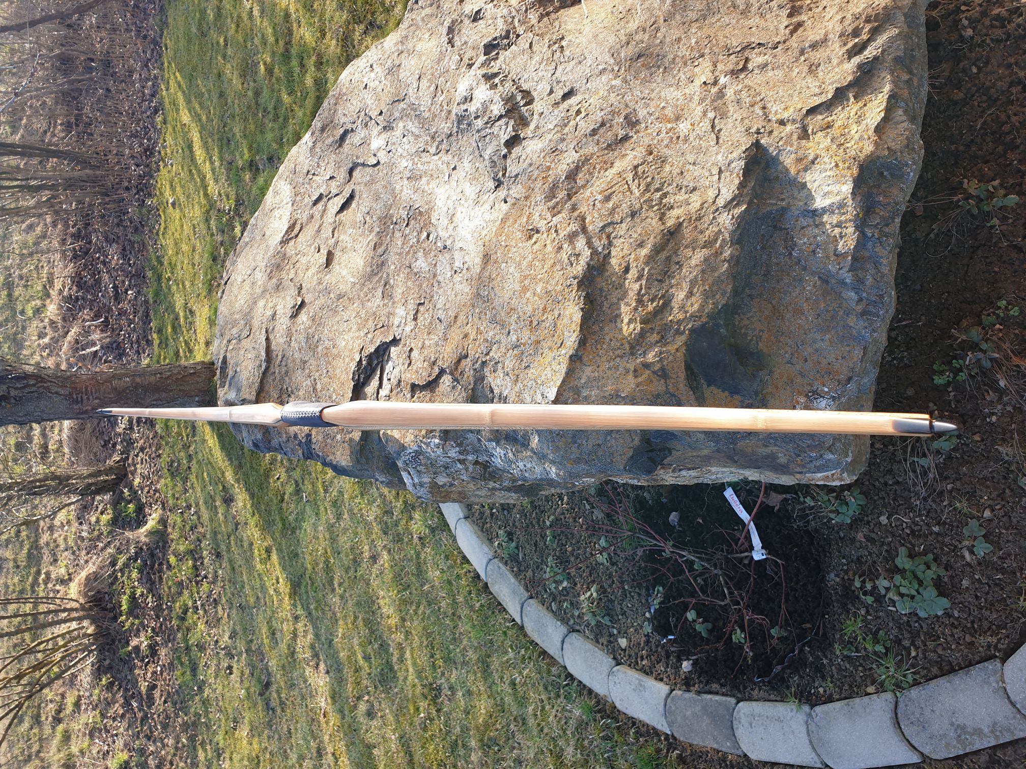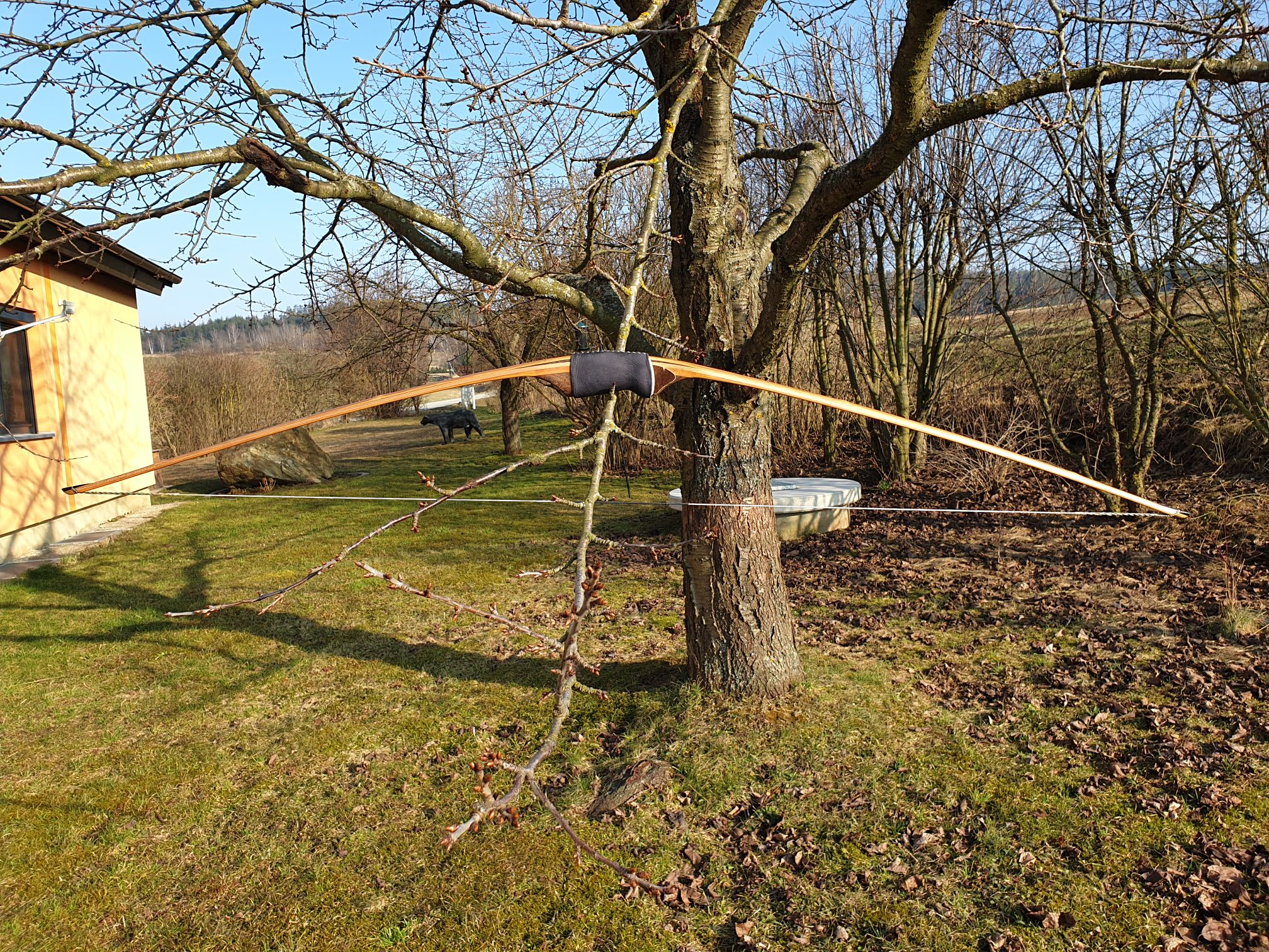 Die Länge beträgt Nock to Nock 64" und er zieht auf meinen Auszug von 26,5" genau 40#. Die Wurfarme sind Pyramidal verjüngt und die Bauchseite ist um einiges Breiter als der Rücken. Beginnend mit 33mm am Bauch und 24mm am Rücken verjüngt er sich auf 12mm am Bauch und 8mm am Rücken. An der Nocke ist er somit auch 8mm breit. Dazu hab ich eine flämisch gespleiste Sehne mit 10 Strang Spectra die an den Öhrchen mit Dacron verstärkt ist. Die Standhöhe beträgt 6,5". Das Finish hab ich mit 800er Schleifpapier und Holzbalsam von Dick gemacht.