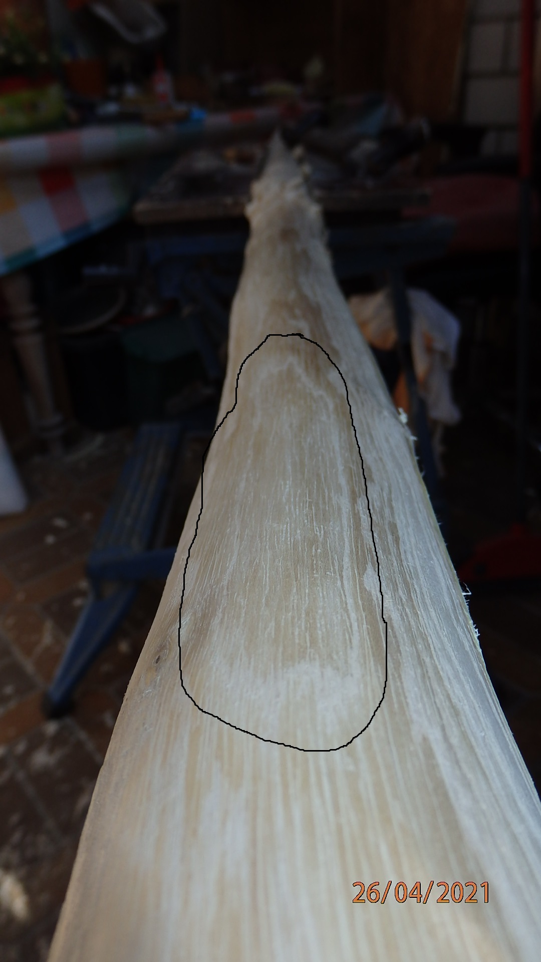 beim Freilegen eines Jahresring habe ich etwa 20cm vom Bogenende wohl etwas zu tief geschnitten bzw. gekratzt, siehe Bild.