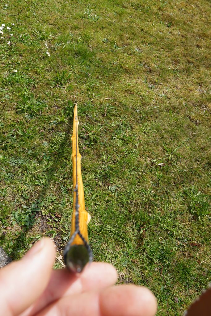 nach langem mal wieder ein Bogen den ich fertig habe. Er geht zu einem Kunden in die Schweiz, der einen Eibenbogen mit Charakter haben wollte. Der Stave war nicht ganz einfach, da vielen Äste in diesem nicht all zu dicken Eibenstave waren. Die Äste liefen so schief in den Stave, dass ich mich entschieden habe(würde ich für mich nicht machen) sie drin zu lassen und etwas mehr Material um die Äste stehen zu lassen. Der dicke Ast hätte ich lieber im oberen Wurfarm gehabt, da er an einer nicht so glücklichen Stelle sitzt, aber dann hätte er bei den Pfeilen gestört. Ich bin ganz zufrieden mit dem Bogen, er wirft (wie bei den meisten Eiben) gut und schnell. Das Gewicht ist nicht das Beste , aber wegen den Ästen war nicht leichter zu bekommen.