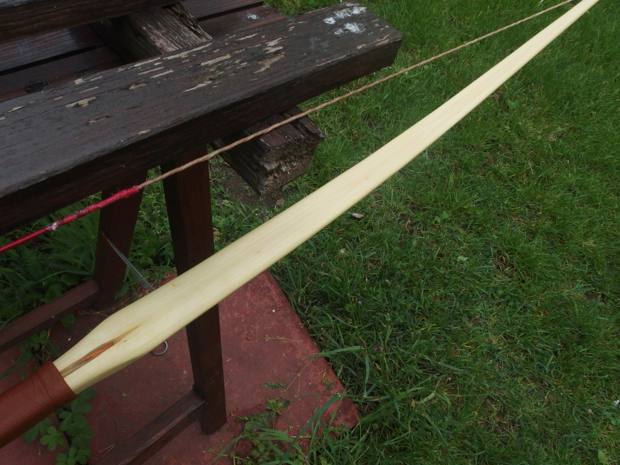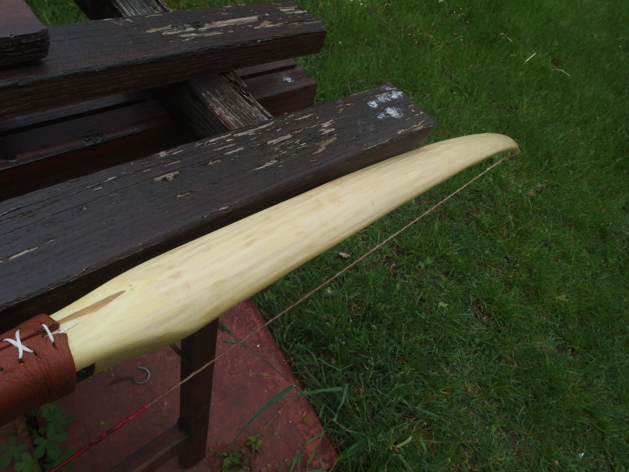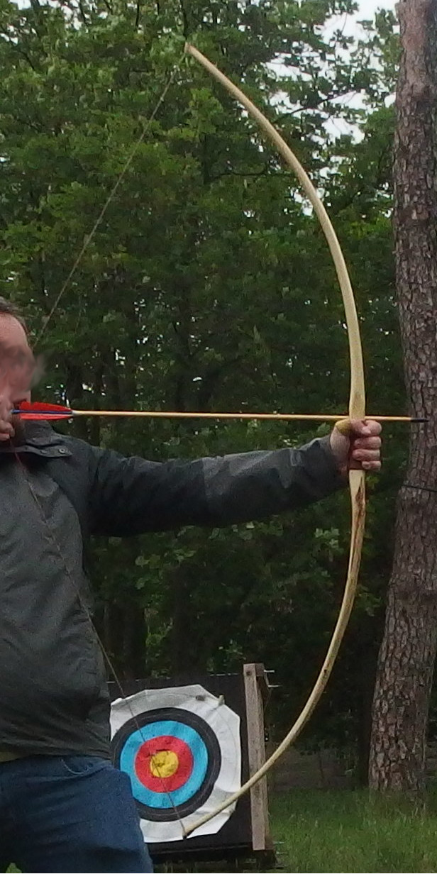 Beim diesjährigen Sap-Wettbewerb habe ich ein Pfaffenhütchen gebaut, das nach dem Einschießen leider zerbrach, weil es griffnah zu wenig bog. Außerdem baute ich einen 50#-Hasel, der zwar gut schoß, aber oben leider eine kleine Schwachstelle hatte, die immer mehr nachgab, wurde also auch nichts. Die Bogenreste standen dann die ganze Zeit rum. Da mir jetzt die Rohlinge ausgehen, hatte ich die Schnapsidee, einen Bastard-Bogen aus beiden Hälften zu bauen, Pfaffenhütchen oben, Hasel unten. Der Spleiß hätte symmetrischer und präziser sein können, das gute Endfest 300 plus ein paar Schraubzwingen halfen aber. Beide Wurfarme habe ich dann nachgetillert. Herausgekommen ist ein Hybrid mit immerhin noch 48# bei 28" AMO (mehr sollte man auch nicht ziehen), Länge NtN nämlich nur 166cm. Arrowpass war noch vom Pfaffenhütchen dabei. Griff aus Leder gabs neu dazu, das verdeckt die meisten Teile vom Spleiß. Schießt sogar überraschend flott, die Kürze wird ihren Teil dazu beitragen. Ich bin doch froh, das ausprobiert zu haben